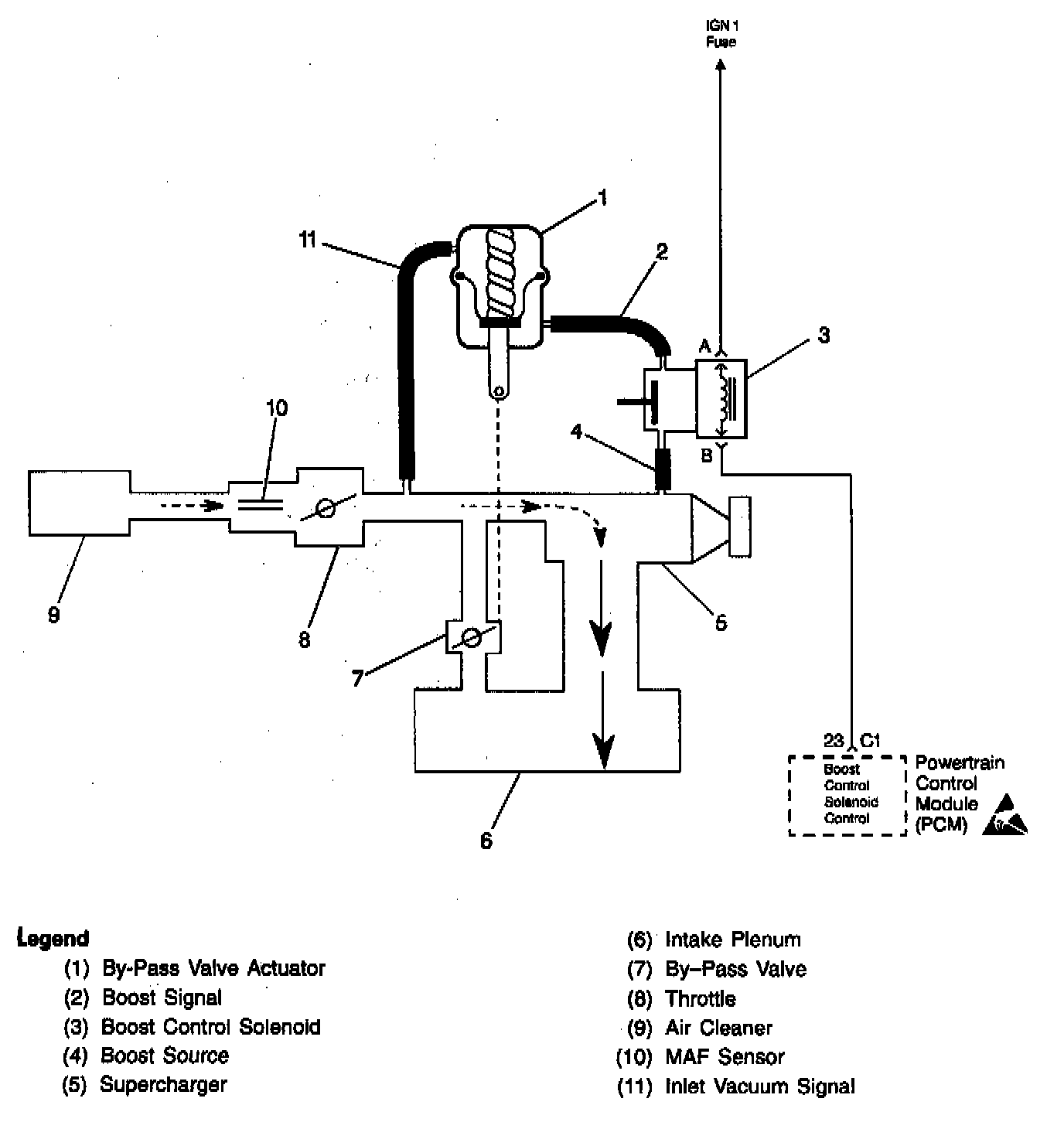 When reduced boost pressure is desired, the PCM commands the boost control solenoid to operate at a 0% duty cycle (OFF). This opens the solenoid valve and allows boost pressure from the intake manifold to counteract the spring tension in the bypass valve actuator, opening the bypass valve and recirculating excess boost pressure back into the supercharger inlet. With reverse gear selected, the PCM commands the boost control solenoid to operate at a 0% duty cycle (OFF) at all times.
