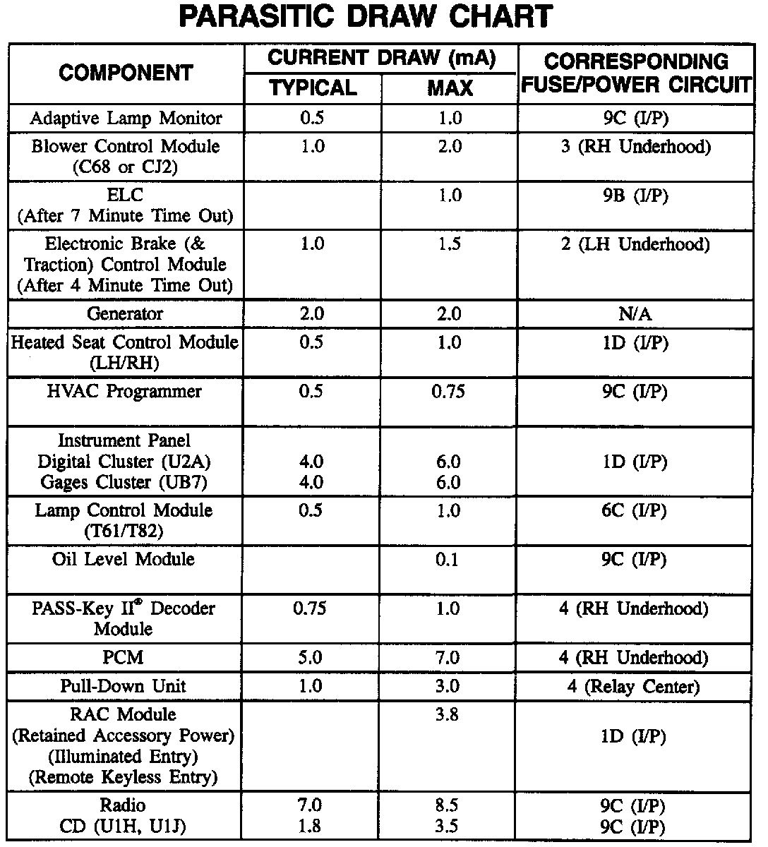11. When current draw is less than 30 milliamps, check charging system for proper operation. When current draw is above 30 milliamps, remove system fuses one fuse at a time until the current draw returns to a value less than or equal to 30 milliamps. Perform steps 8 through 10 each time a fuse is removed. Refer to the Parasitic Draw Chart for typical and maximum parasitic loads for various vehicle components.