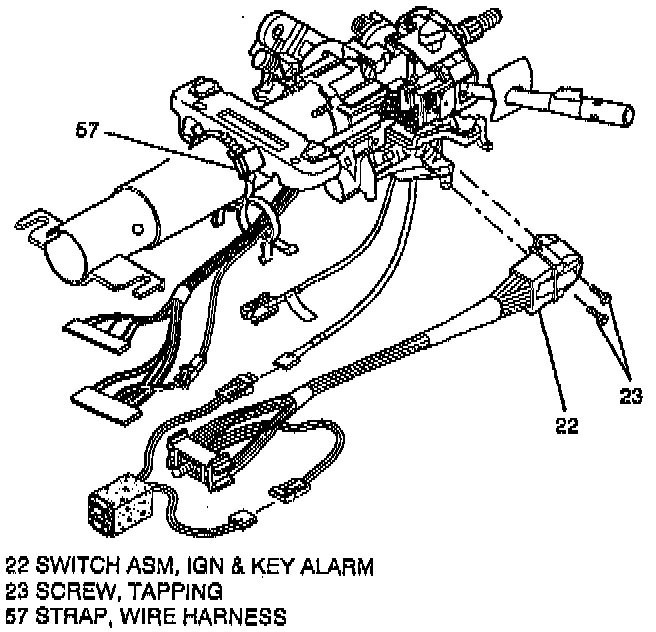 4. Ignition & key alarm switch assembly (22) wire harness from wire harness strap (57).
