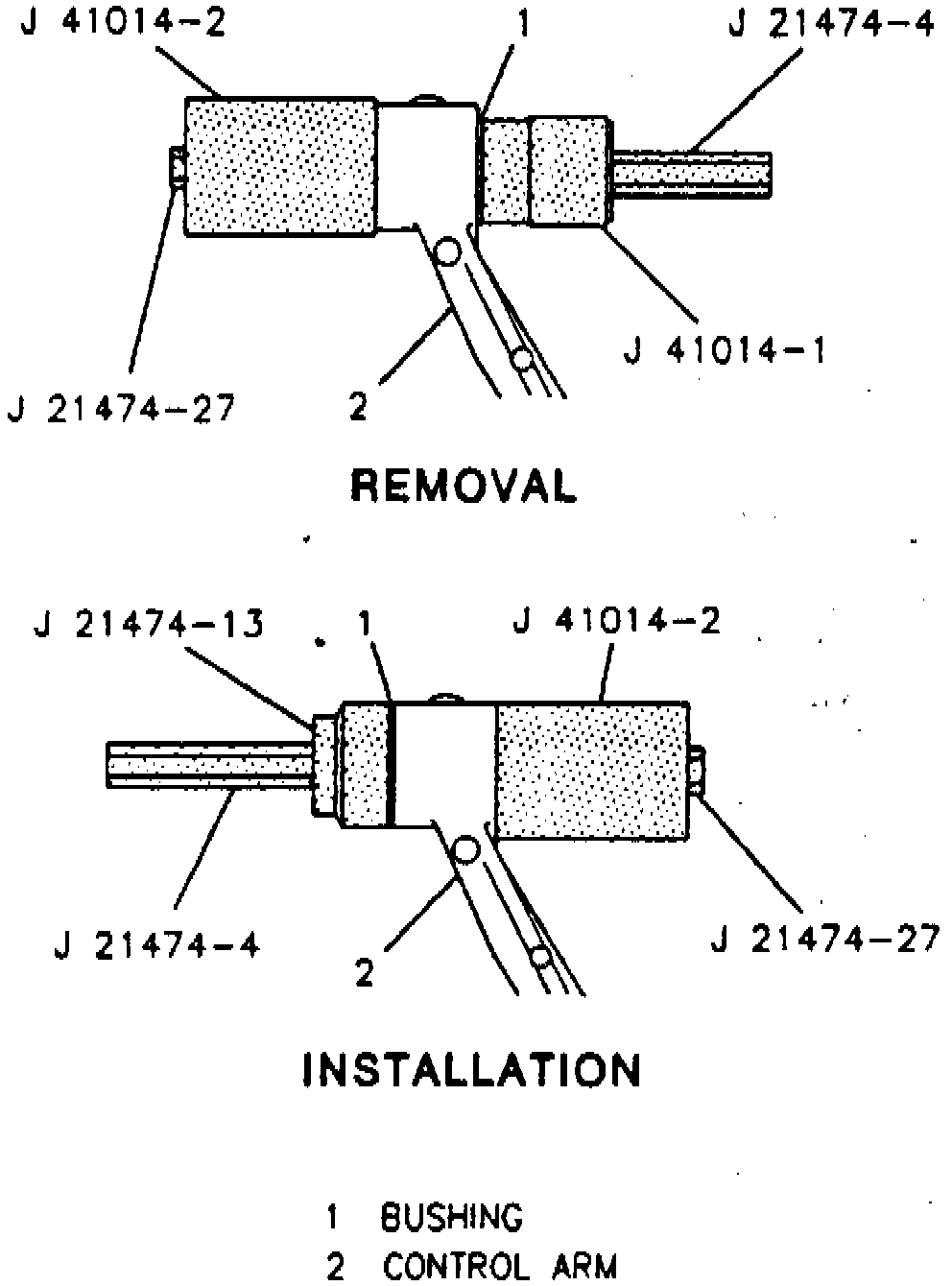 2. Tighten nut J 21474-4 until bushing is driven out of control arm.