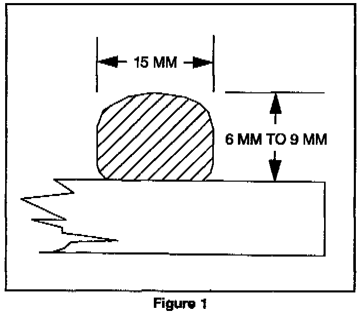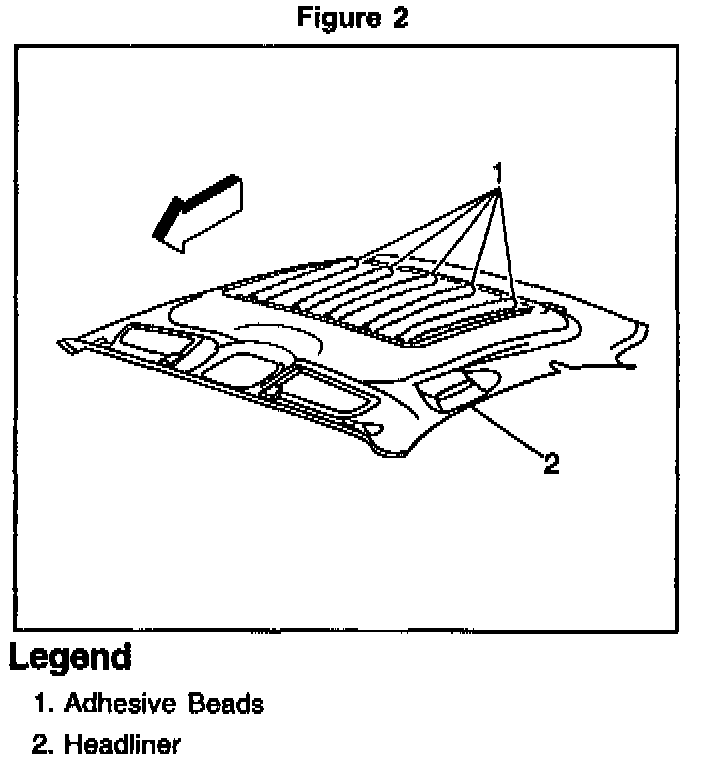 1. Apply 6 mm to 9 mm (1/4 to 11/32 inch) beads of adhesive 15 mm (5/8 inch) wide (Figure 1) where it was previously removed from cardboard insulator. When a new cardboard roof insulator is used, place adhesive as shown in Figure 2; the adhesive location is marked on the cardboard insulator. The Concours/DeVille has six beads of adhesive; the Eldorado, Seville, Aurora, Riviera and Park Avenue have five.