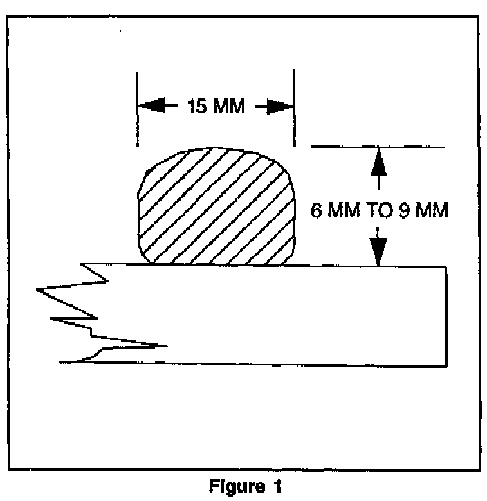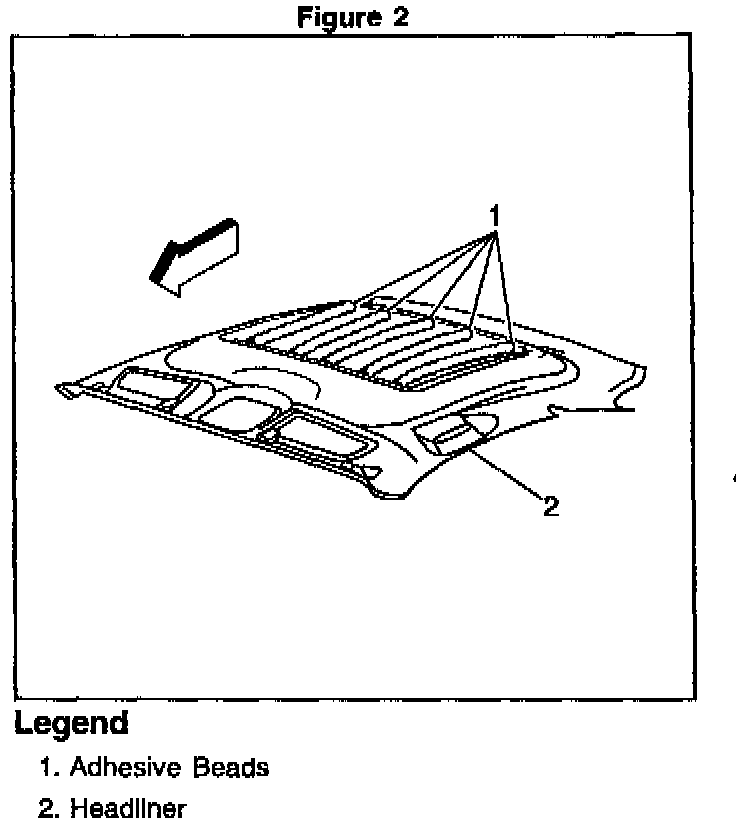 1. Apply 6 mm to 9 mm (1/4 to 11/32 inch) beads of adhesive 15 mm (5/8 inch) wide (Figure 1) where it was previously removed from cardboard insulator. When a new cardboard roof insulator is used, place adhesive as shown in Figure 2; the adhesive location is marked on the cardboard insulator. The Concours/DeVille has six beads of adhesive; the Eldorado, Seville, Aurora, Riviera and Park Avenue have five.