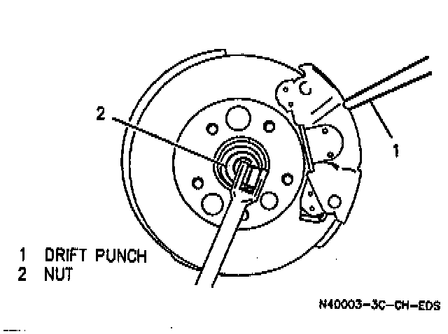 6. Hub nut. Insert drift or screwdriver into caliper and rotor to prevent rotor from turning.