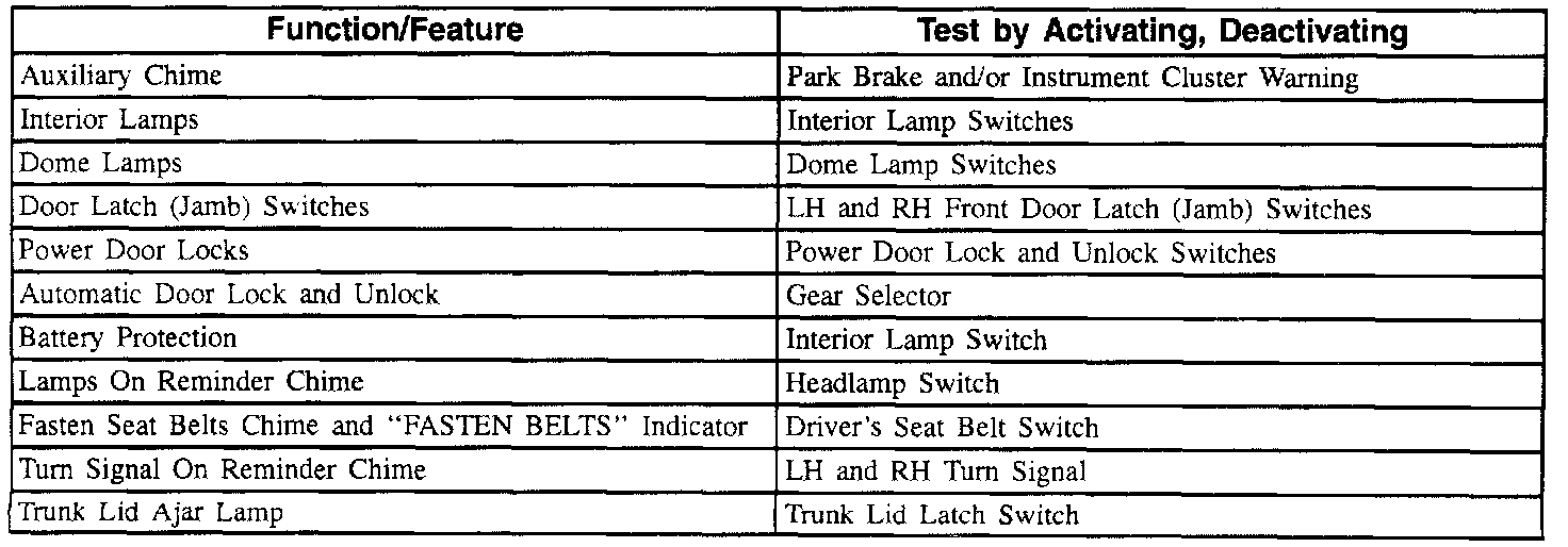 While in the (I/O) mode, the technician may least each input to the MALL module by activating/deactivating its input device (for example, door latch switch, interior lamp switch, seat belt switch, etc.). The MALL module provides feedback on each input transition in the form of a single bong along with a simultaneous flash of the "FASTEN BELTS" indicator.
