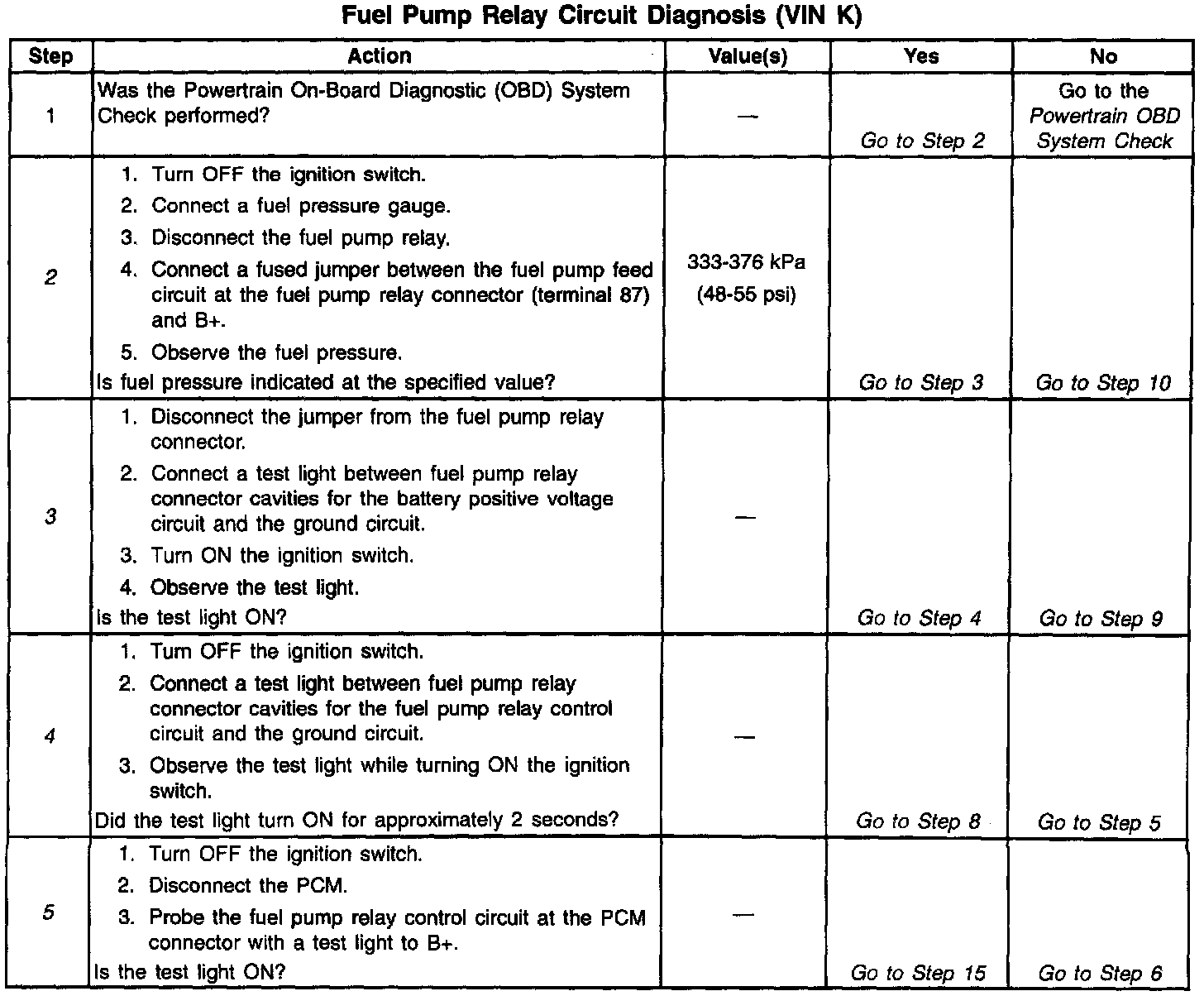 2. Verifies that the fuel pump feed circuit is OK between the fuel pump relay and the fuel pump, and that the fuel pump can deliver adequate pressure to the fuel rail.