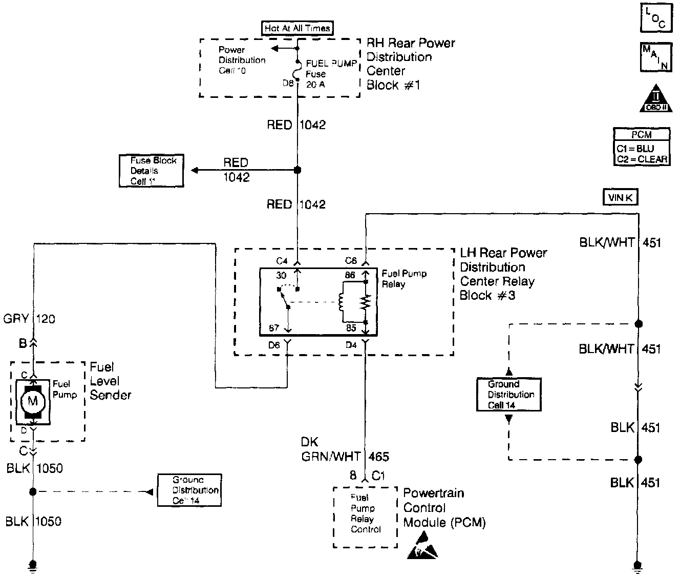 When the ignition switch is first turned ON, the PCM energizes the fuel pump relay which applies battery positive voltage to the in-tank fuel pump. The fuel pump relay will remain ON as long as the engine is running or cranking and the PCM is receiving reference pulses. If no reference pulses are present, the PCM de-energizes the fuel pump relay within seconds after the ignition is turned ON or the engine is stopped.