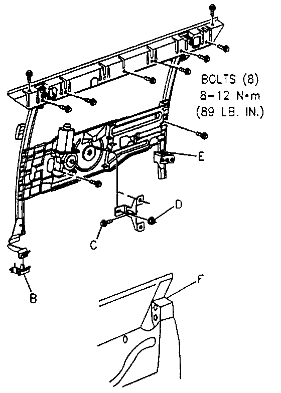 5. Adjust bracket "E" to original adjustment position (previously marked) to prepare the system for window adjustment.