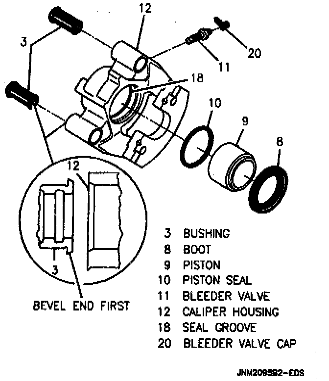 Inspect Caliper housing bore and seal groove for scoring, nicks, corrosion and wear. Use crocus cloth to polish out light corrosion. Replace caliper housing if corrosion in and around seal groove will not clean up with crocus cloth.