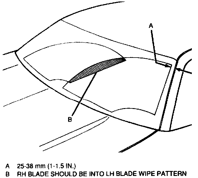 ^ Run wipers and check for correct wipe pattern. LH blade tip should wipe to a limit of 25-38 mm (1-1.5 in.) from outside edge of glass. RH blade should overlap into LH wipe pattern.