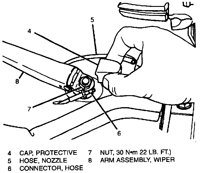 4. Lift wiper arm assembly (8) and insert a suitable pin or pop rivet completely through the two holes located next to pivot of arm assembly.