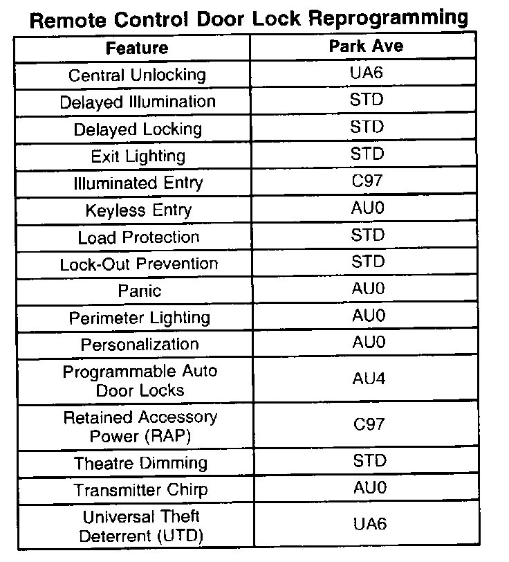 12.1. Use the RPO chart and select the functions that are standard or optional for the particular vehicle being serviced. Failure to program the RFA module properly may cause the system to malfunction. A malfunction may cause misdiagnosis and customer complaints.