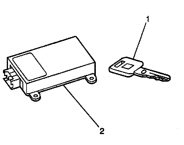 The Body Control Module (BCM) (2) is the PASS-key(R) II controller and performs the ignition key resistance identification and communication of the pass or fail condition to the Powertrain Control Module (PCM). Security is provided by determining if a valid ignition key (1) has been used in an attempt to start the engine and if so, communicating a fuel enable and starter enable message to the (PCM).
