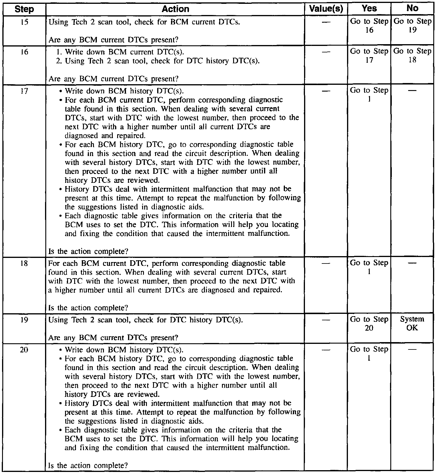 The Body Control Module (BCM) Diagnostic System Check is an organized approach to identify problems associated with the BCM. The BCM Diagnostic System Check must be the starting point for any BCM-related complaint. The BCM Diagnostic System Check will direct you to the next logical step in diagnosing the complaint. The BCM is a very reliable component and it is not likely the cause of the malfunction. Most BCM system malfunctions are linked to faulty wiring, connectors, and occasionally to other vehicle components. Understanding the BCM and using the diagnostic tables correctly will reduce diagnostic time and prevent unnecessary parts replacement.