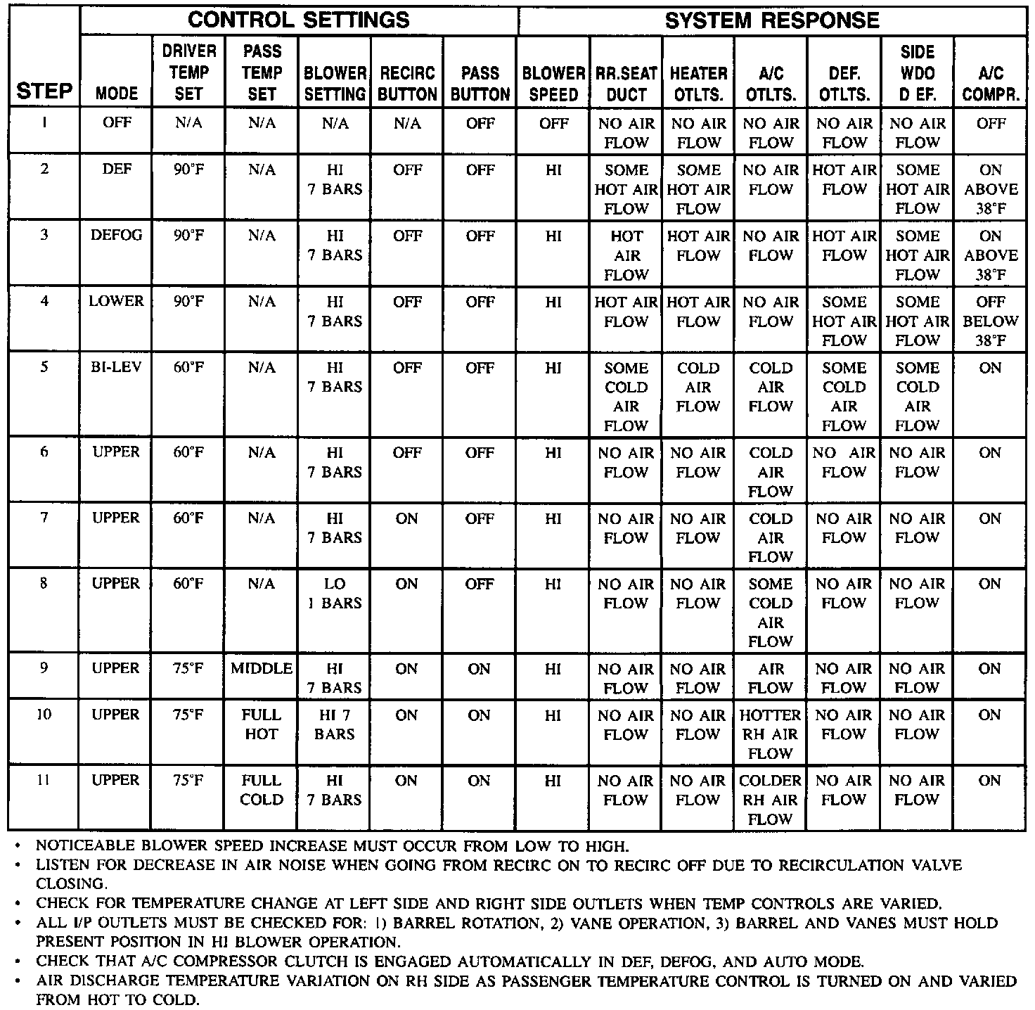 The following is a list of quick checks used to determine if the system is functioning properly. Before initiating the quick check procedures, cycle the ignition switch ON, then OFF, and then ON again. The heater A/C temperature and mode LED's should light and repeat at the same positions as the ignition is cycled. With the ignition on, without interruption for a minimum of three minutes to allow for the blower delay to time out, test the HEAT functions. A check of the following mode sequences indicates if any mode selections are not functioning properly. The compressor will not operate at ambient temperatures below 3°C (38°F).
