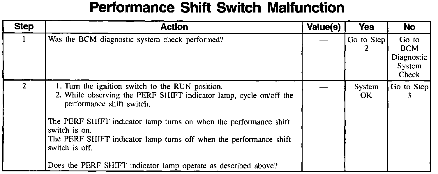 When the BCM receives a ground signal in circuit 1493, the BCM sends a message through the Class II serial data link indicating that the performance shift switch is on. This message commands the Instrument Panel Cluster (IPC) to turn on the PERF SHIFT indicator lamp. Also, this message notifies the Powertrain Control Module (PCM) that the driver selected the performance shift mode.