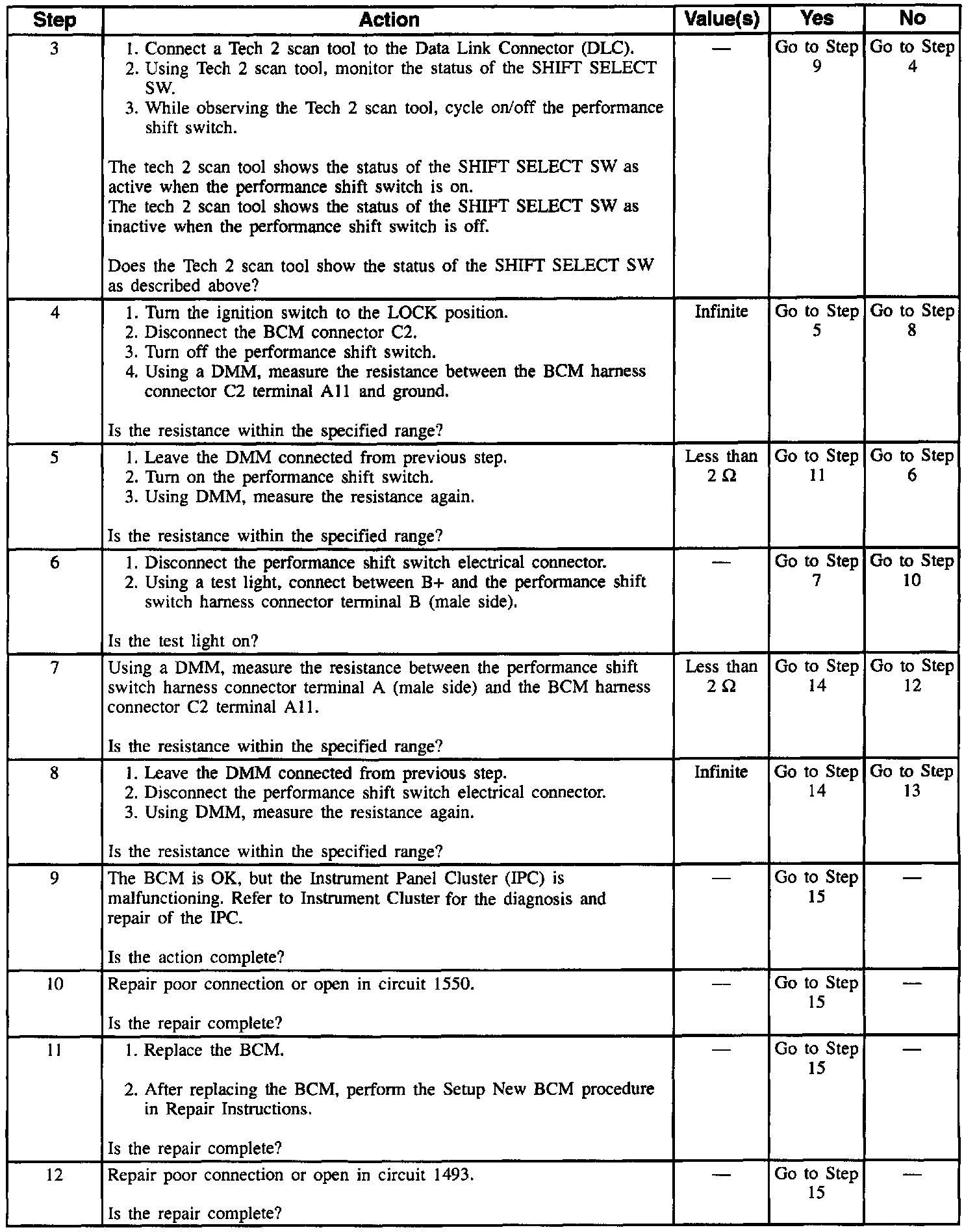 When the BCM no longer receives a ground signal in circuit 1493, the BCM sends a message through the Class II serial data link indicating that the performance shift switch is off. This message commands the IPC to turn off the PERF SHIFT indicator lamp. Also, this message notifies the Powertrain Control Module (PCM) that the driver has turned off the performance shift switch.