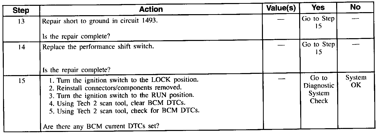 8. Determines whether circuit 1493 is shorted to ground or the performance shift switch is faulty (contacts closed all the time).