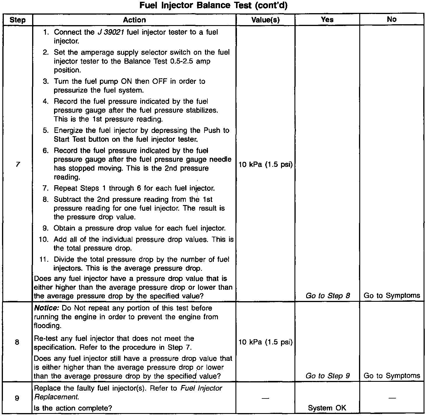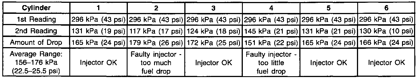 7. If the pressure drop value for each fuel injector is within 10 kPa (1.5 psi) of the average pressure drop value, the fuel injectors are flowing properly. Calculate the pressure drop value for each fuel injector by subtracting the second pressure reading from the first pressure reading. Refer to the Injector Balance Test Example.
