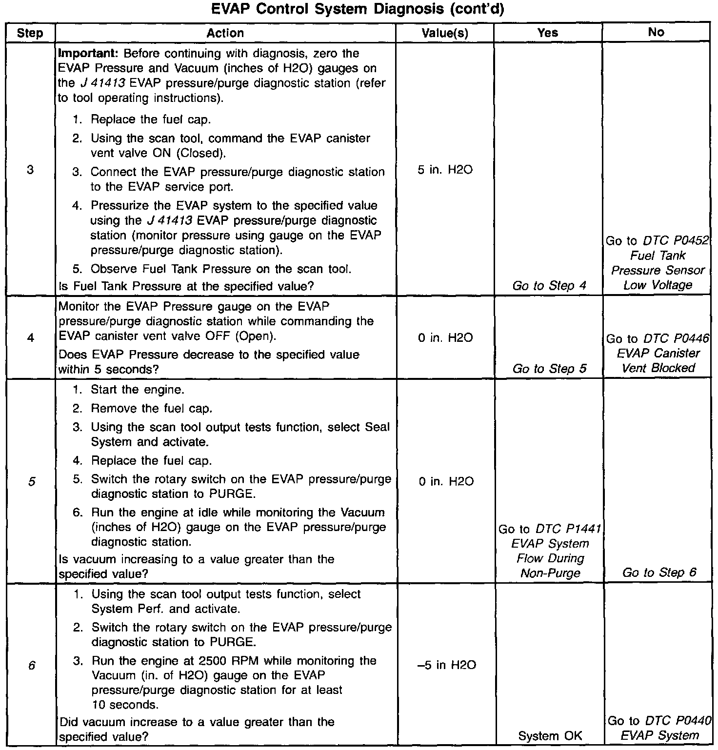 A stuck closed EVAP purge solenoid, stuck open [1][2]EVAP vent solenoid, disconnected or damaged EVAP purge line or vent hose, leaking fuel cap, or fill neck should set a DTC P0440. A small leak in the EVAP system should set a DTC P0442. An EVAP vent solenoid stuck closed, a restricted vent hose, or a blocked EVAP canister should set a DTC P0446. A continuous purge condition with no purge commanded by the PCM (EVAP purge solenoid stuck open or leaking) should set a DTC P1441. Refer to Diagnostic Trouble Code Tables for further diagnostic procedures regarding the EVAP system. Testing and Inspection