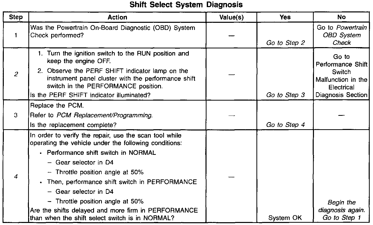 The Driver Shift Select System allows the driver to select one of two shift patterns, NORMAL or PERFORMANCE. Pressing the shift select switch button on the shifter handle changes the shift pattern.