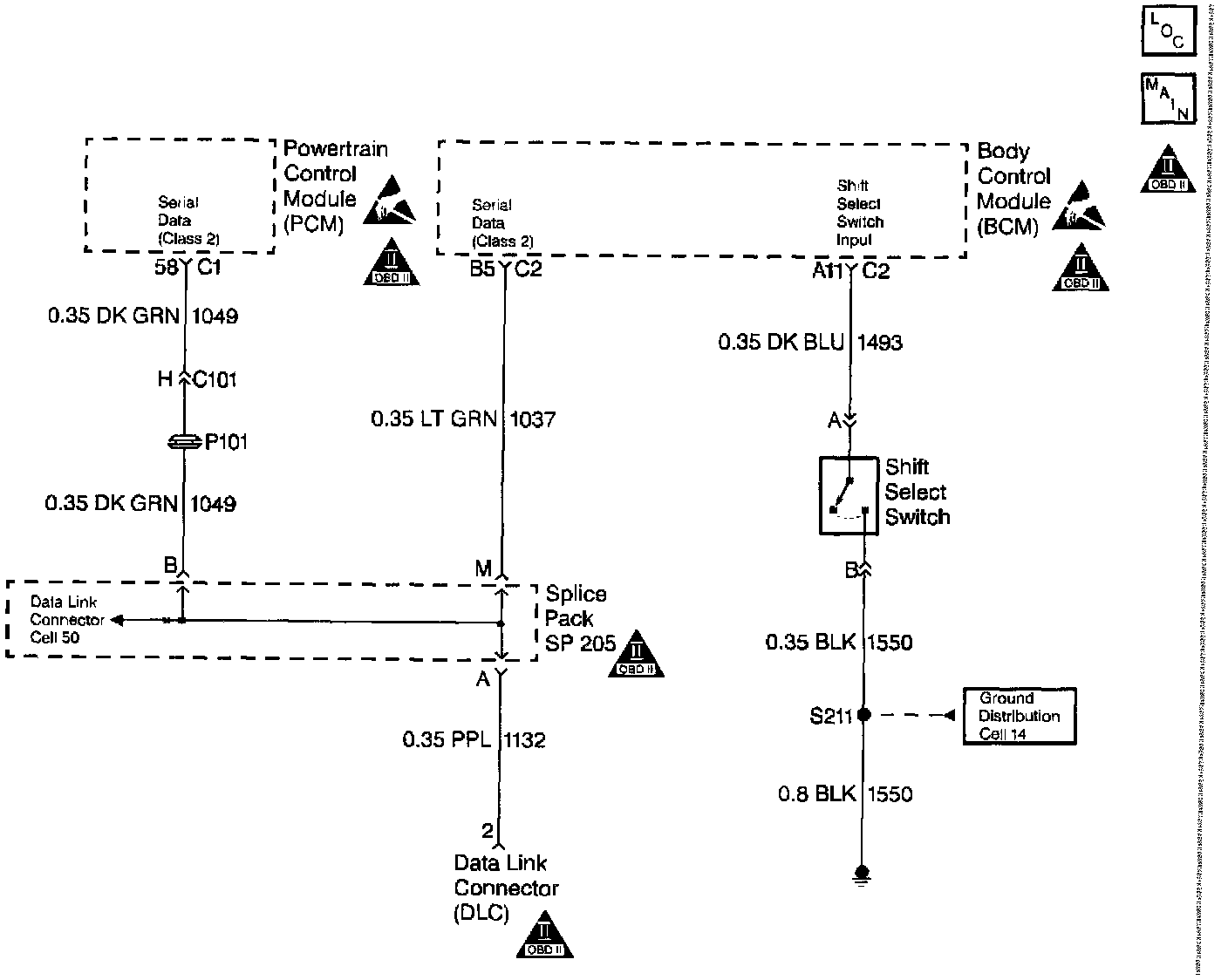 The performance shift switch provides a ground signal to the Body Control Module (BCM) by connecting circuits 1493 (DK BLU) and 1550 (BLK). When the BCM receives this input, it sends a message to the Powertrain Control Module (PCM) and the Instrument Panel Control (IPC) Module. This signal activates the performance shift control program in the PCM and commands the IPC Module to illuminate the PERF SHIFT indicator on the instrument panel.