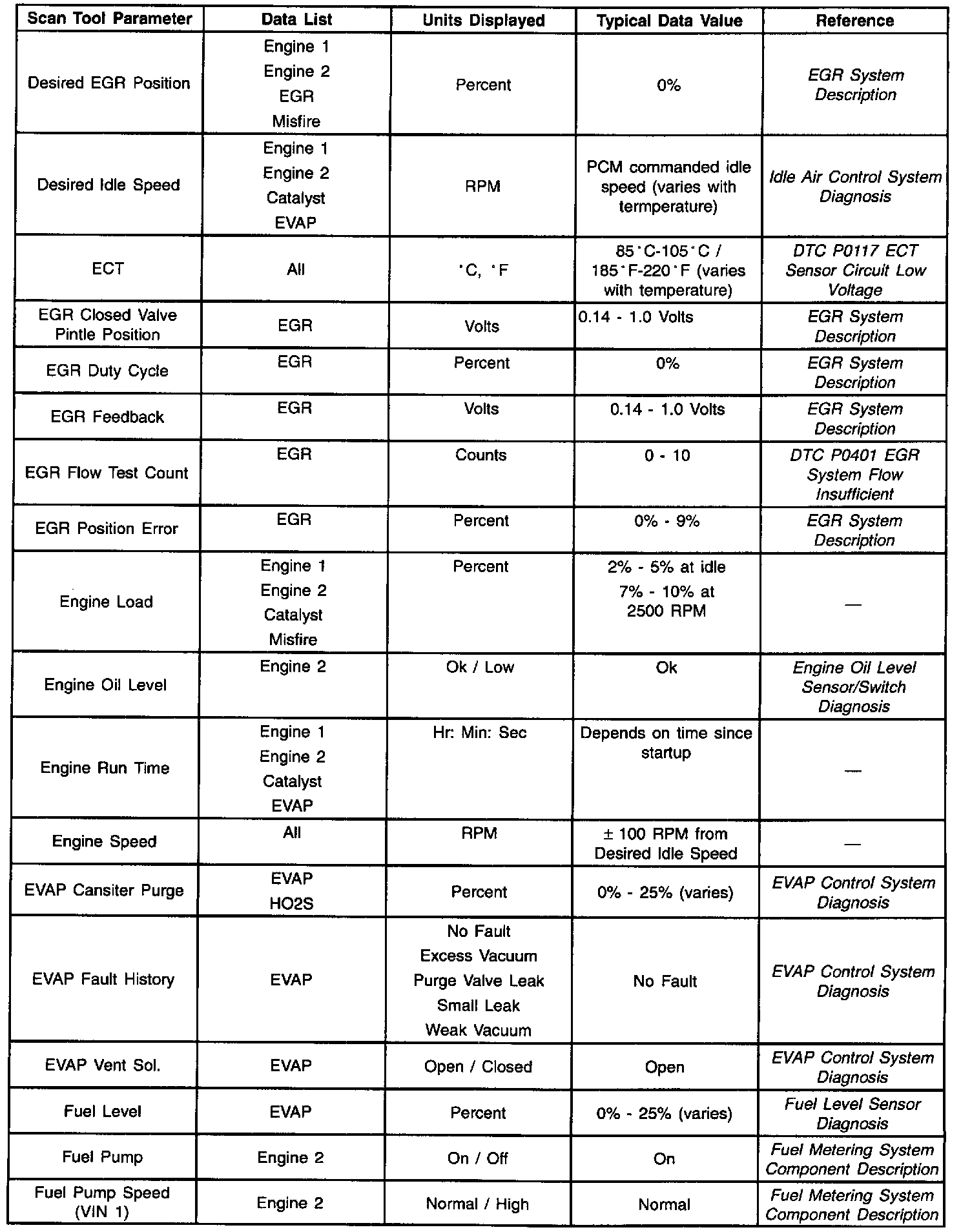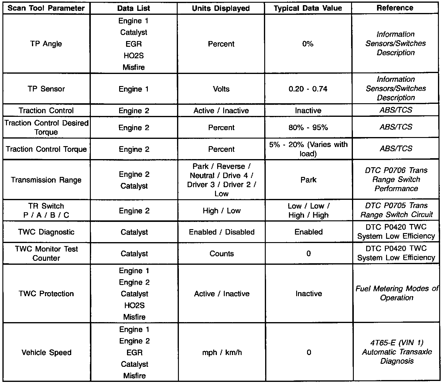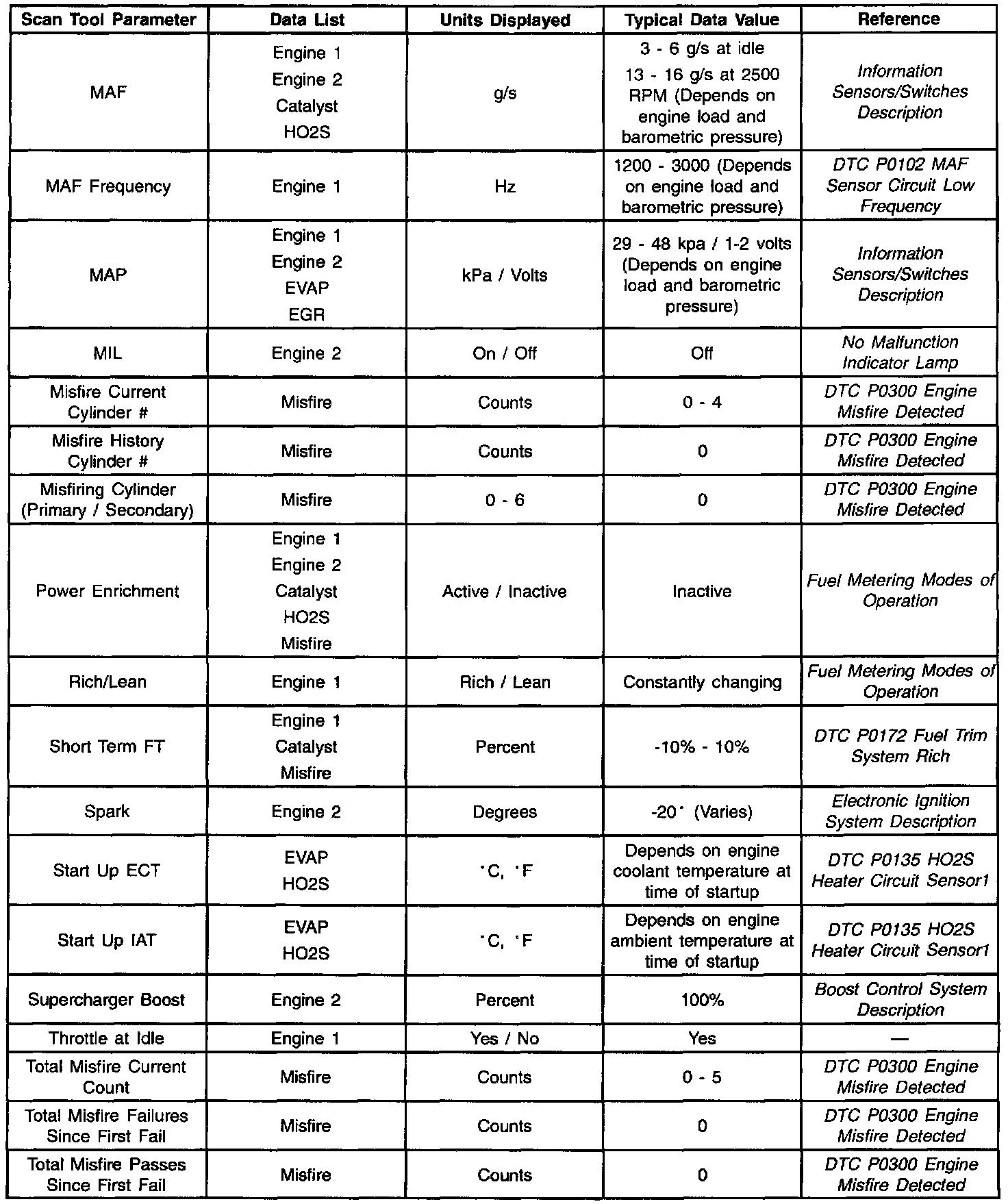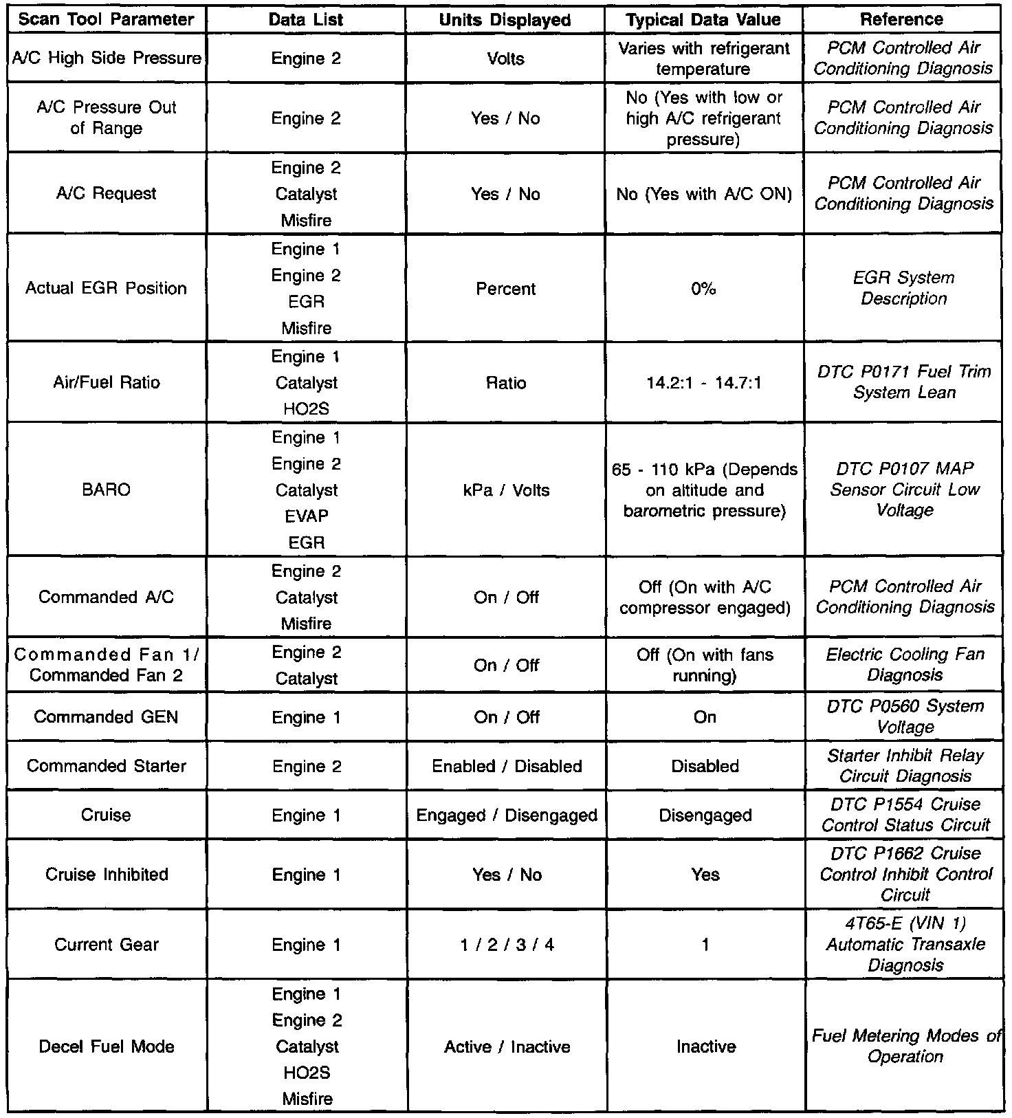 Only the parameters listed are referred to in this service manual for use in diagnosis. For further information on using the scan tool to diagnose the PCM and related sensors, refer to the applicable reference section listed below. If all values are within the typical range described, refer to Symptoms section for diagnosis. The Typical Scan Data Values table contains all the parameters included in the following data lists arranged in alphabetical order: