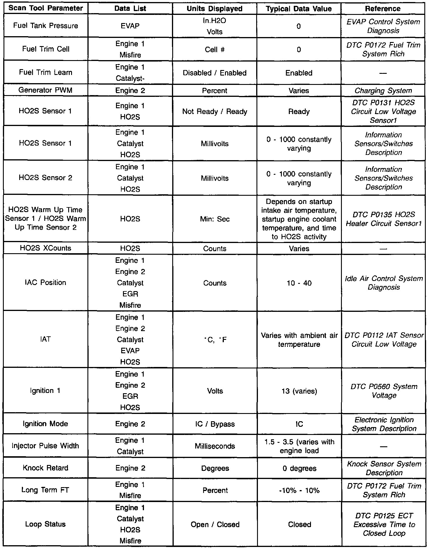 Use the Typical Scan Data Values table only after the Powertrain On-Board Diagnostic System Check has been completed, no DTC(s) were noted and you have determined the on-board diagnostics are functioning properly. Scan tool values from a properly running engine may be used for comparison with the engine you are diagnosing. The Typical Scan Data values represent values that would be seen on a normally running engine.