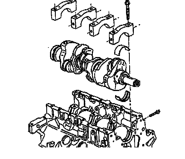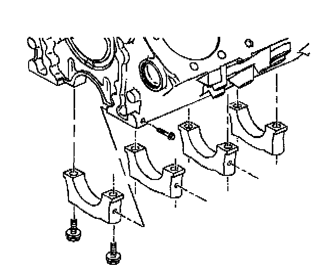 Notice: In order to prevent the possibility of cylinder block or crankshaft bearing cap damage, the crankshaft bearing caps are tapped into the cylinder block cavity using a brass, lead, or a leather mallet before the attaching bolts are installed. Do not use attaching bolts to pull the crankshaft bearing caps into the seats. Failure to use this process may damage a cylinder block or a bearing cap.