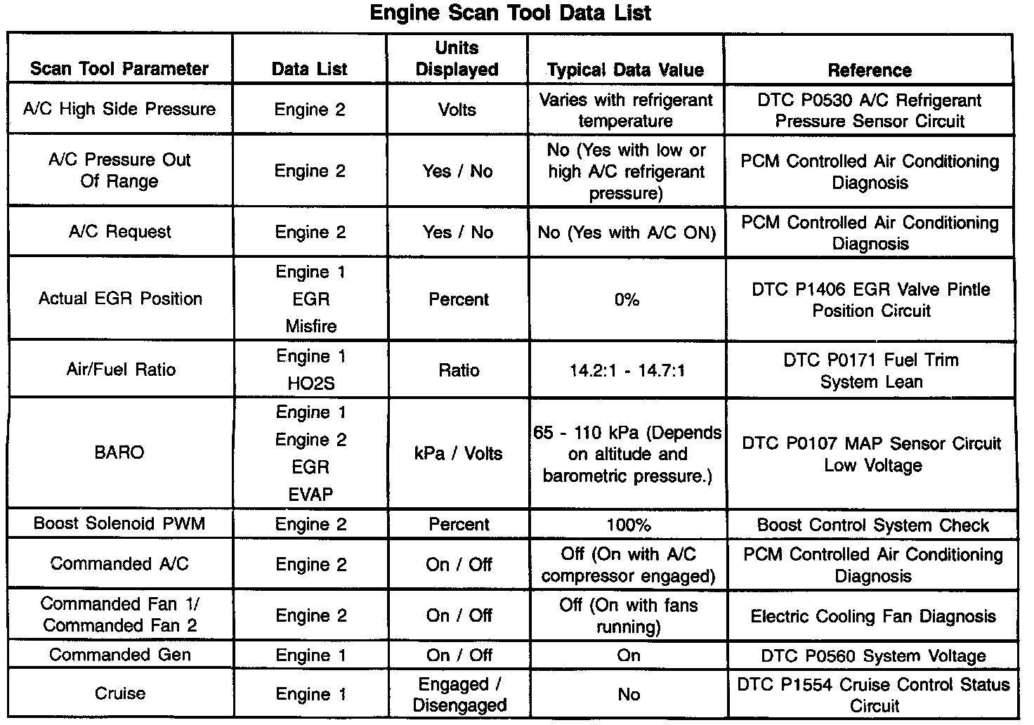 Use the Typical Scan Data Values table only after the Powertrain On-Board Diagnostic System Check has been completed, no DTC(s) were noted and you have determined the on-board diagnostics are functioning properly. Scan tool values from a properly running engine may be used for comparison with the engine you are diagnosing. The Typical Scan Data values represent values that would be seen on a normally running engine.