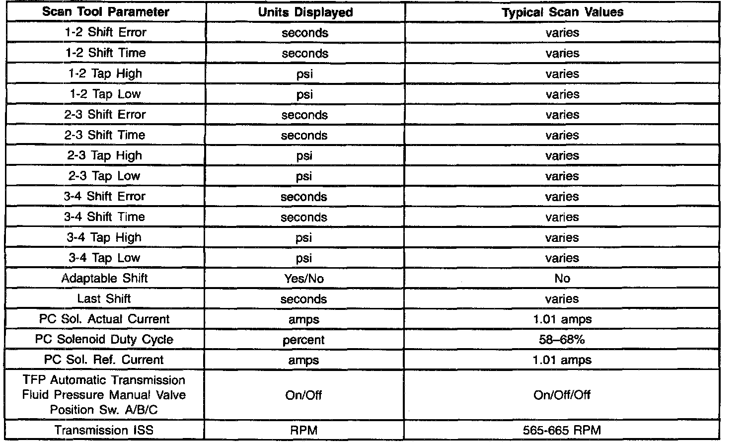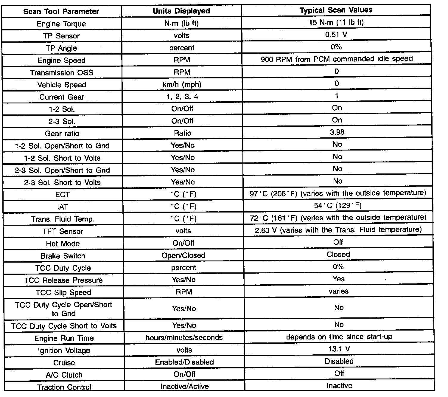 If you have completed the On-Board Diagnostic (OBD) system check, if the diagnostics are functioning properly and if no DTCs display, you may use the Typical Scan Values in the table below for comparison within the appropriate transmission. These typical values are an average of display values recorded from normally operating vehicles. They represent the display from a normally functioning system.