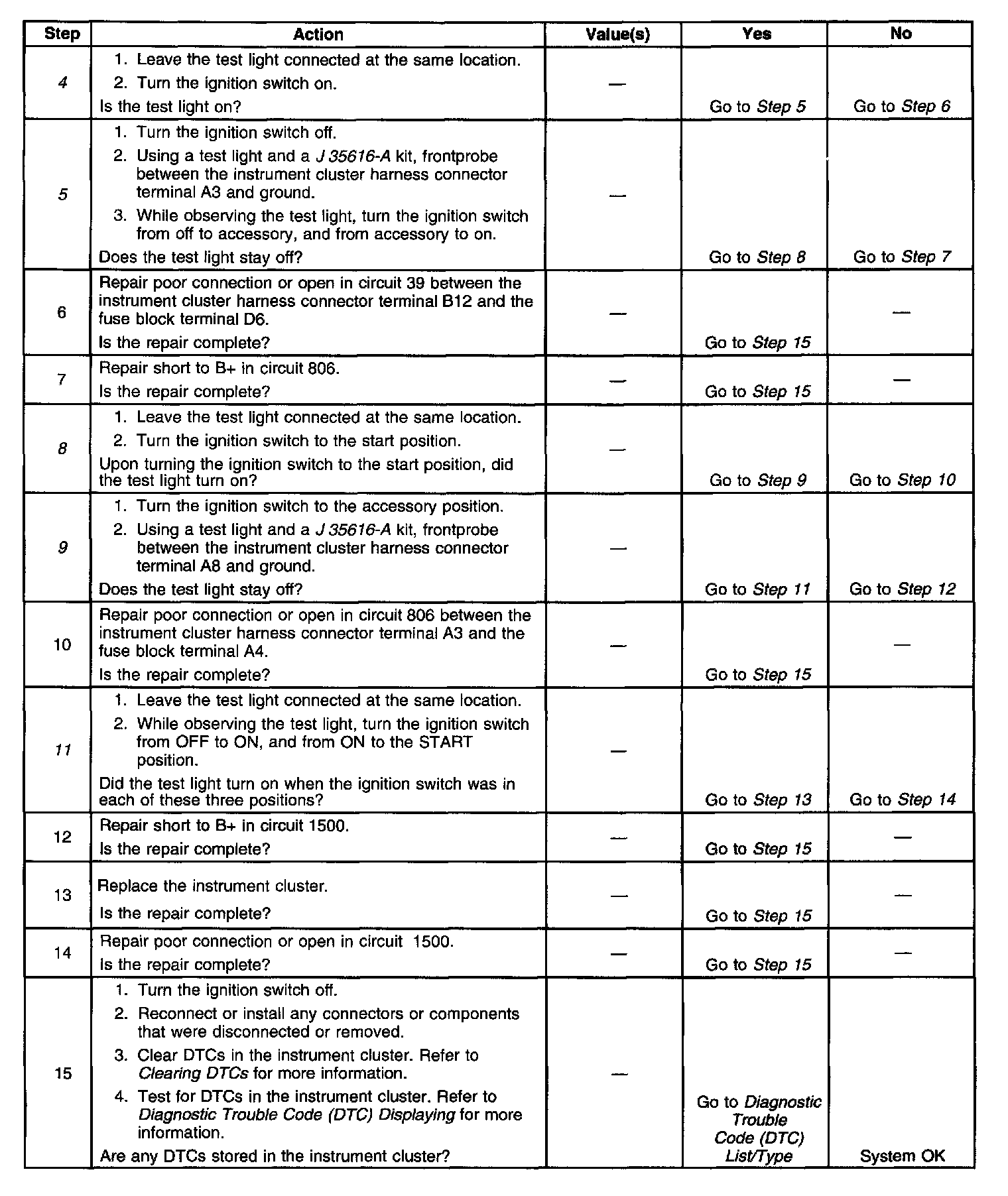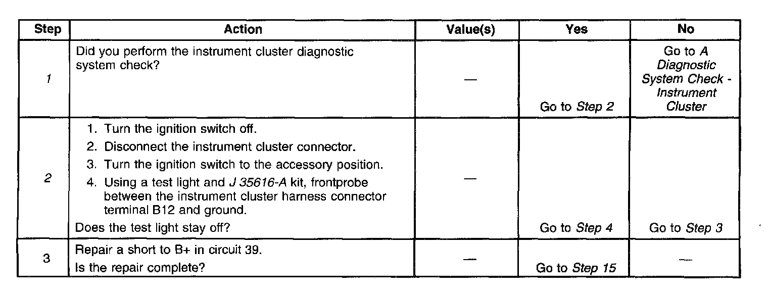^ The instrument cluster no longer detects an open or short to B+ in circuits 39, 806 and 1500.