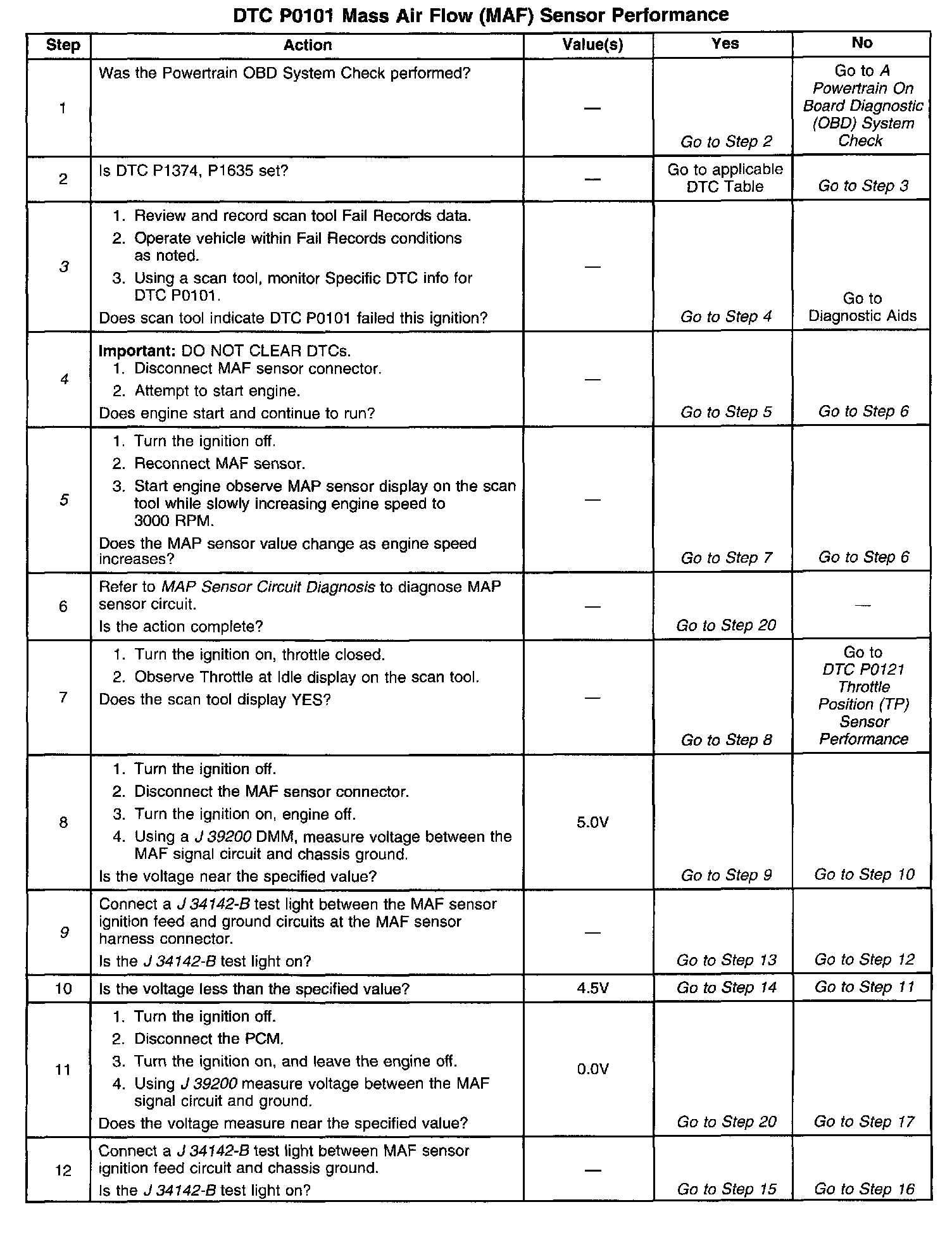 ^ The actual Mass Air Flow is compared to a calculated Mass Air Flow based on the MAP, TP, and engine RPM readings (speed density). A skewed/unresponsive MAP sensor at key ON will cause the calculated Mass Air Flow value to be inaccurate. When the engine is started a calculated difference between actual Mass Air Flow and Calculated Mass Air Flow occurs. DTC P0101 will set, the vehicle will stall, a default Mass Air Flow based on the MAP sensor will occur. Because the MAP sensor is skewed/unresponsive the default Mass Air Flow values are incorrect and vehicle may not restart. If a fault occurs which causes the MAP sensor value to be incorrect (poor vacuum connections, damaged vacuum source, or defective vacuum hose(s), unmetered air into the manifold), DTC P0101 will set and the default mass airflow value will be substituted. Because the MAP sensor value is incorrect the vehicle may not start and run.
