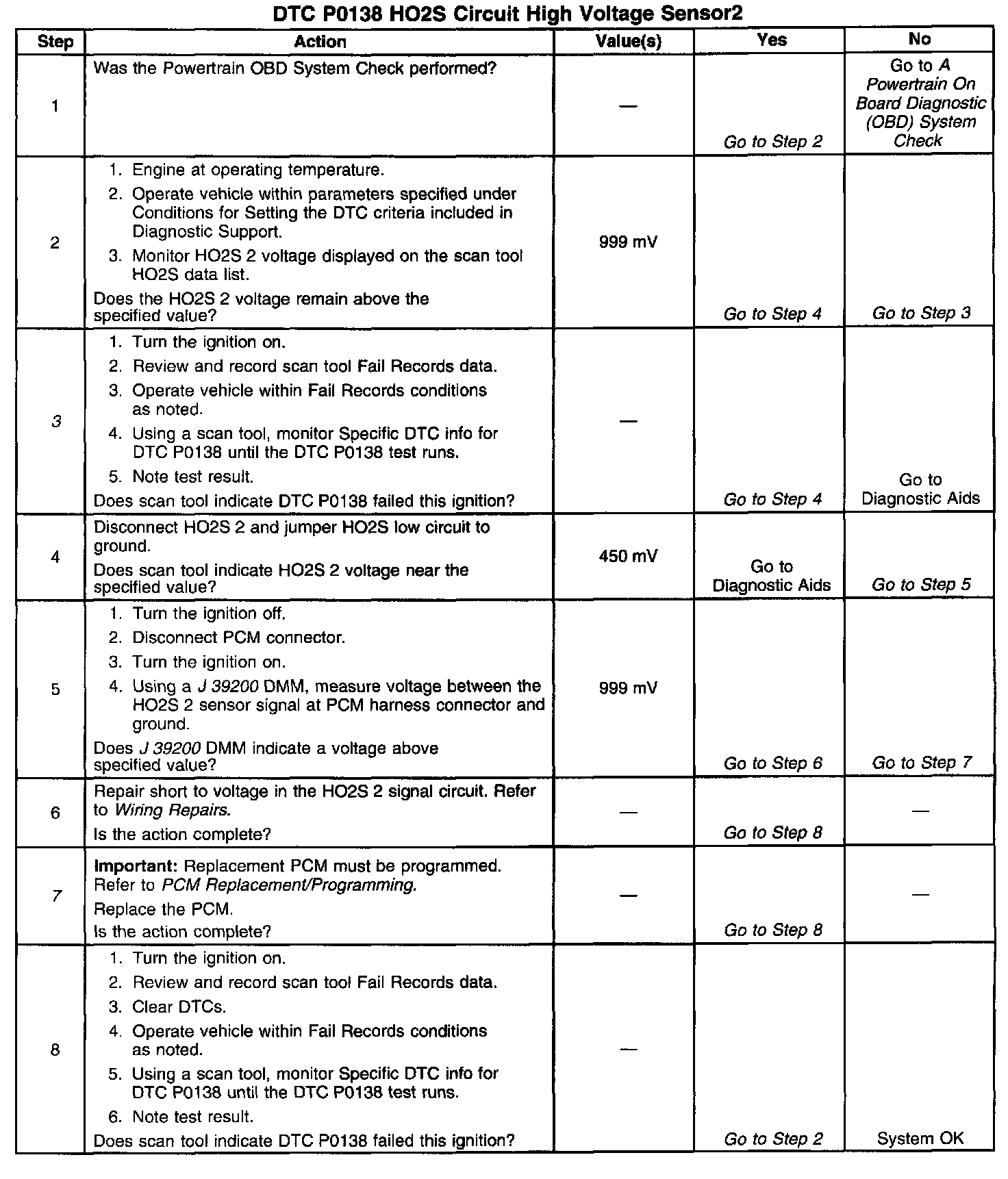 3. DTC P0138 being set during deceleration fuel mode operation may indicate a condition described in the Diagnostic Aids above. If the DTC P0138 test passes while the Fail Records conditions are being duplicated, an intermittent condition is indicated. Reviewing the Fail Records vehicle mileage since the diagnostic test last failed may help determine how often the condition that caused the DTC to be set occurs. This may assist in diagnosing the condition.