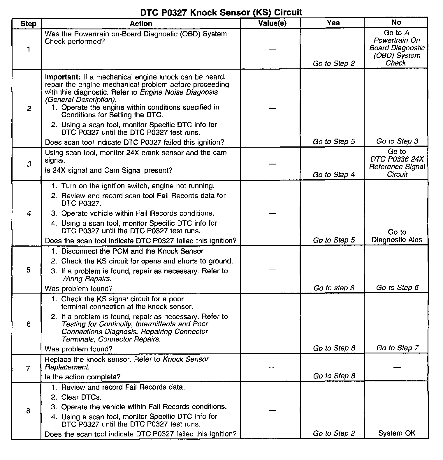 3. If both the 24X Crank Sensor and the Cam signal are not present the KS signal will stop updating and may set DTC P0327. The ignition positive voltage supply and the ground circuits need to be diagnosed using the DTC P0336.