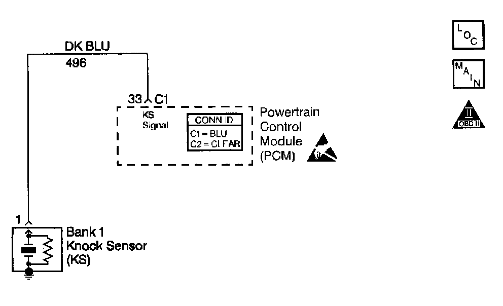 The PCM contains integrated Knock Sensor (KS) diagnostic circuitry. An input signal from the knock sensor is used to detect engine detonation, allowing the PCM to retard Ignition Control (IC) spark timing based on the amplitude and frequency of the KS signal being received. The knock sensor produces an AC signal under all engine operating conditions. During engine operation, the PCM calculates the average voltage of the knock sensor signal. If the knock sensor system is operating normally, the PCM will see KS signal voltage vary above and below the calculated voltage average. If the PCM detects KS input signal equal to the KS average voltage over 95% of a calibrated time, DTC P0327 will set.