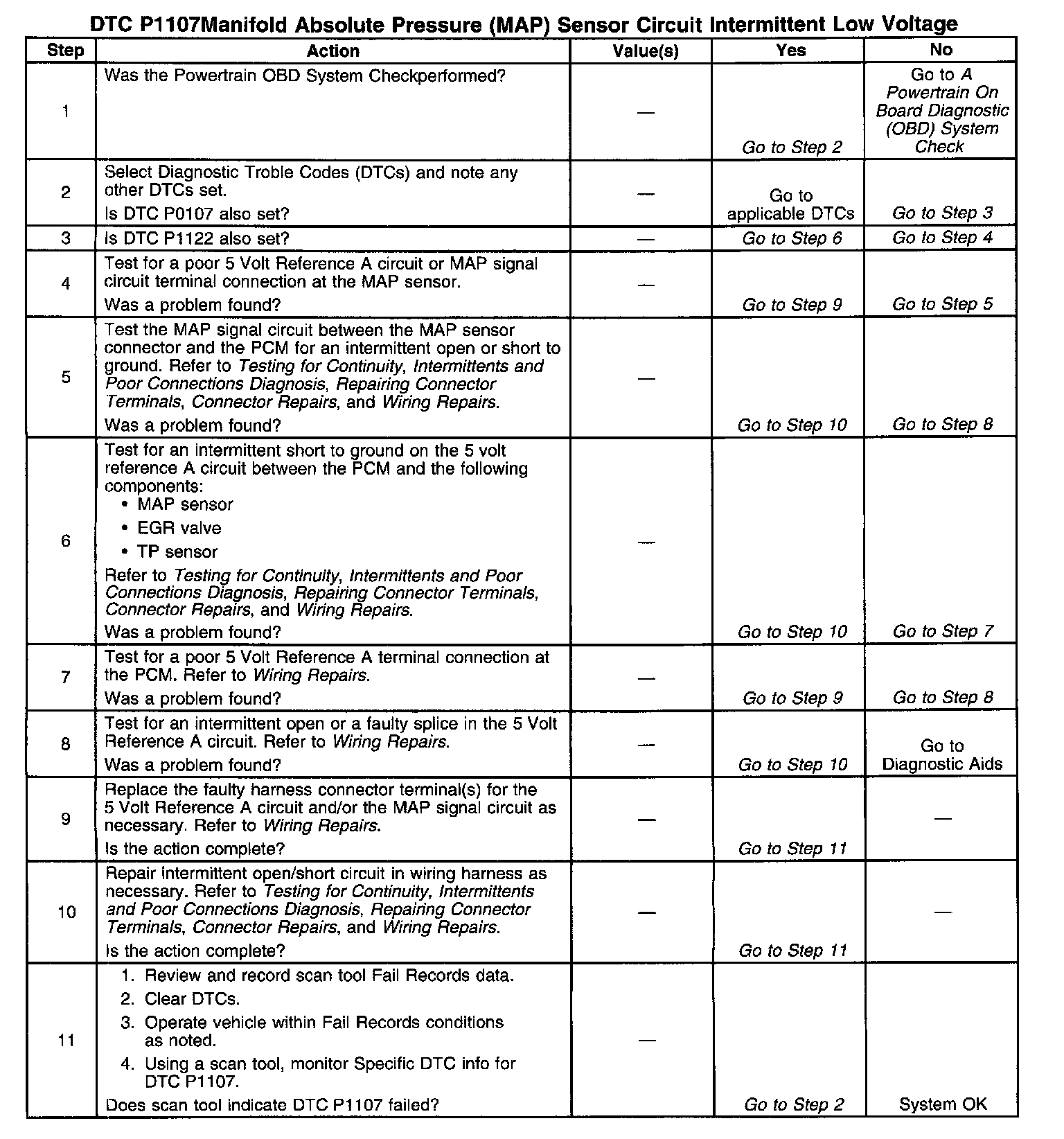 The MAP sensor is used to determine manifold pressure changes while the linear EGR flow test diagnostic is being run (refer to DTC P0401 Exhaust Gas Recirculation (EGR) Flow Insufficient), to determine engine vacuum level for some other diagnostics and to determine barometric pressure (BARO). The PCM monitors the MAP signal for voltages outside the normal range of the MAP sensor. If the PCM detects a MAP signal voltage that is intermittently low, DTC P1107 will be set. P0401