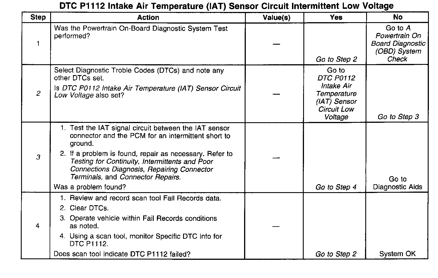 3. If DTC P1112 can be repeated only by duplicating the Fail Records conditions. The Temperature vs Resistance table may be used to test the IAT sensor at various temperatures to evaluate the possibility of a shifted sensor that may be shorted above or below a certain temperature. If this is the case, replace the IAT sensor.