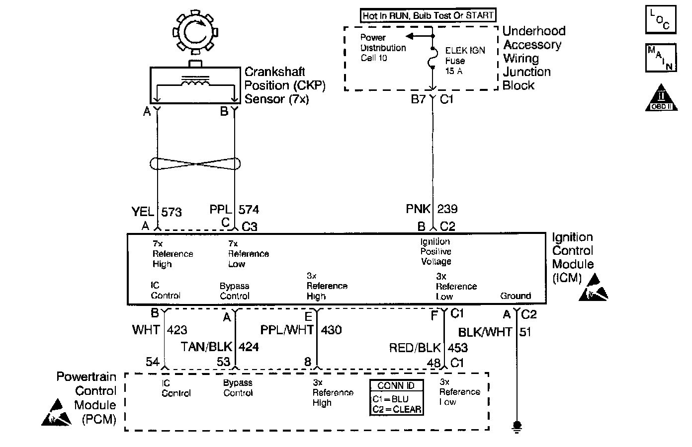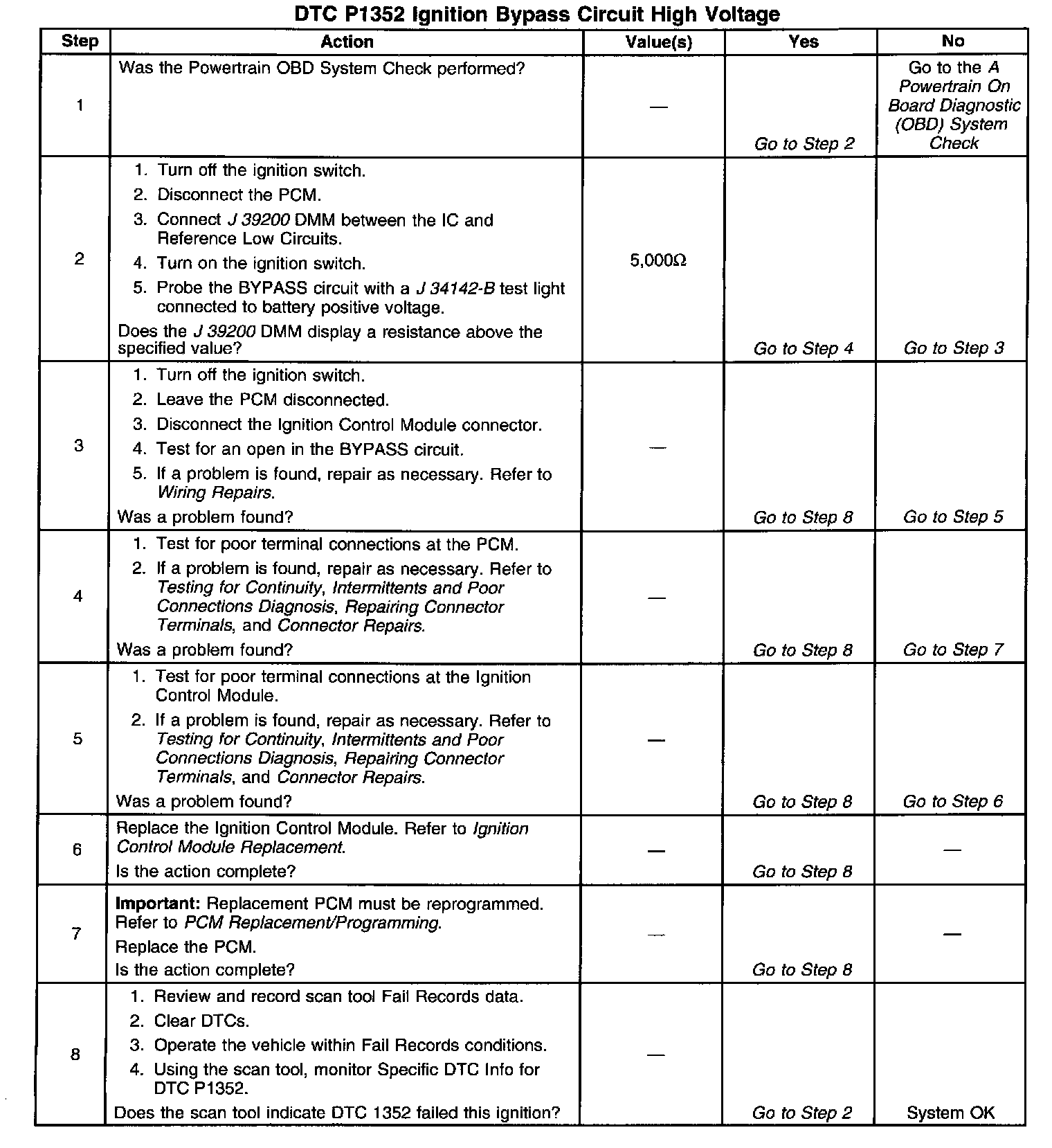 The Ignition Control (IC) Module sends signals that the PCM requires for fuel control and spark advance calculations. At the start of engine crank, the IC Module controls spark advance (Bypass mode.) When the second 3X reference pulse is recognized by the PCM, the PCM applies 5 volts to the Bypass circuit, commanding the IC Module to switch spark advance to PCM control (IC mode). If the PCM detects an open in the Bypass circuit, DTC P1352 will set. The engine will start and may run in Bypass mode timing.