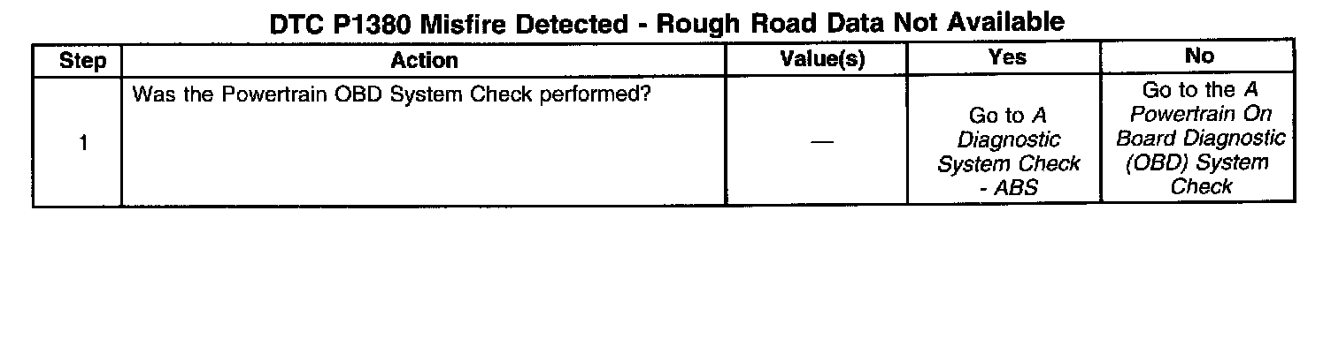 DTC P1380 set indicates that the Antilock Brake/Traction Control (ABS/TCS) system has detected a malfunction which will not allow the EBCM/EBTCM to transmit correct rough road data to the PCM. The A Diagnostic System Check - ABS should be used to diagnose this condition.