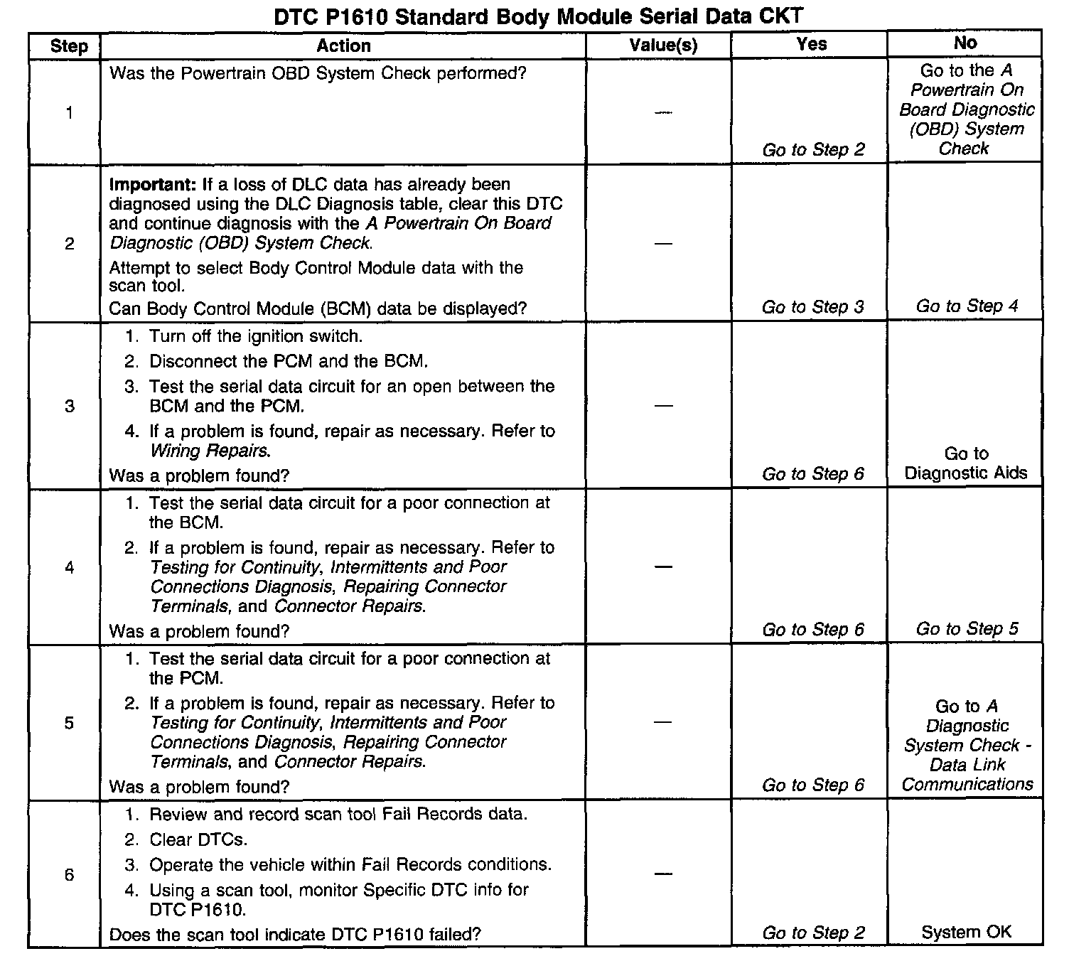 The PCM uses the serial data circuit to communicate with various other devices and systems in the vehicle. The PCM ensures that communication remains established by monitoring the serial data circuit for state of health messages from the other devices using the circuit. If the PCM detects a loss of the state of health serial data message from the Standard Body Module (BCM), DTC P1610 will be set.
