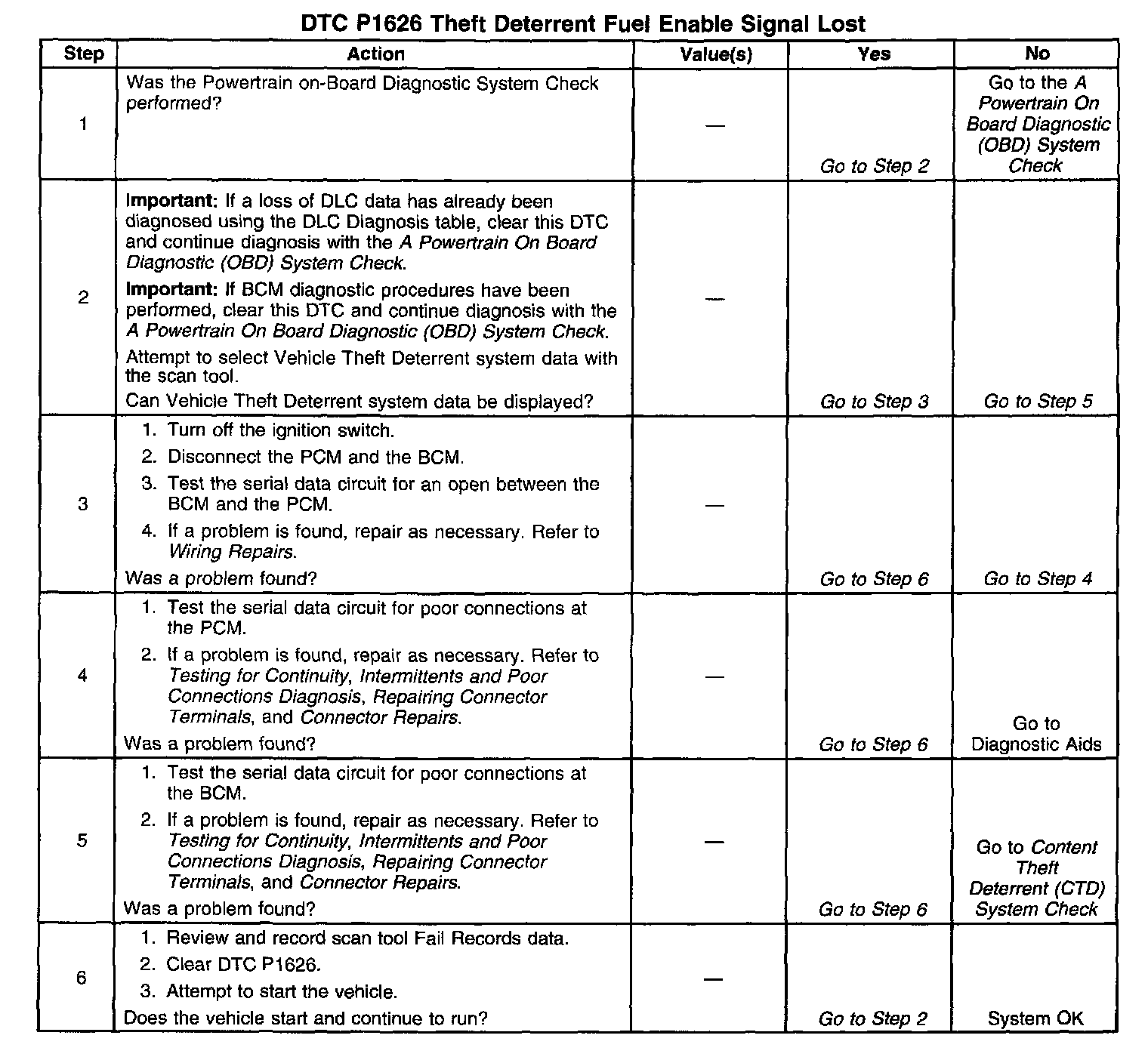 The Vehicle Theft Deterrent (VTD) system is incorporated within the Body Control Module (BCM). The PCM monitors the state of health serial data message from the VTD system to ensure that the PCM to BCM communications is established. If the PCM detects a loss of the state of health message while the engine is running, DTC P1626 will be set. DTC P1626 can cause a no-start condition or normal operation depending on when the loss of VTD system communication was detected. The engine will continue to start and run if the condition that set DTC P1626 occurred after the PCM received a valid VTD password from the BCM and already allowed fuel during the ignition cycle. The engine will start and immediately stall if the condition that set DTC P1626 occurred before the PCM received a valid VTD password. With this condition present, the PCM will inhibit fuel delivery and disable the starter until a valid VTD password is detected. Refer to Content Theft Deterrent (CTD) Circuit Description, and Vehicle Theft Deterrent (VTD) Operation in Antitheft and Alarm Systems.