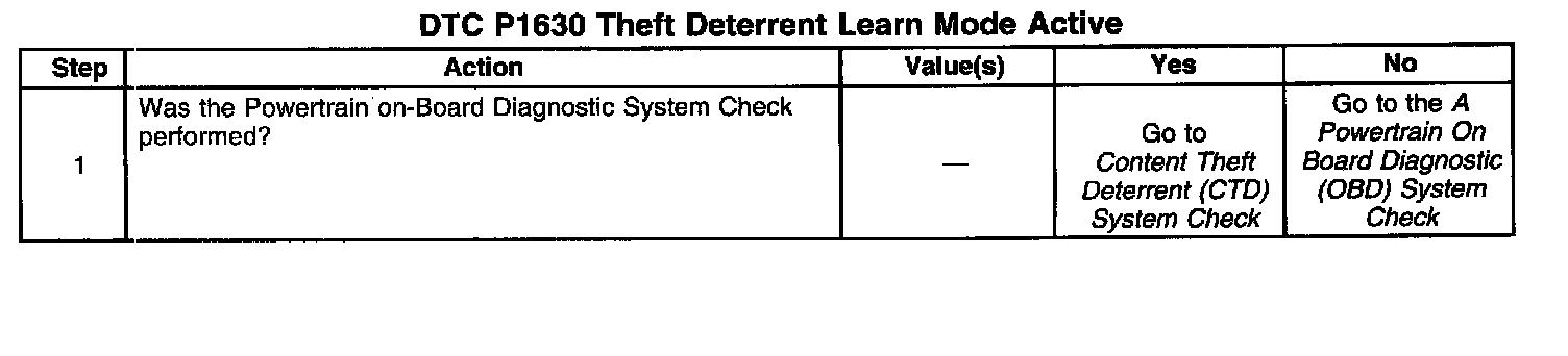 The theft deterrent system is incorporated within the Body Control Module (BCM). If the BCM has been replaced, the password must be relearned using approved Techline diagnostic equipment. If the PCM is replaced, the replacement PCM should learn the password within a few seconds after the ignition is turned ON. DTC P1630 is an information code indicating that the PCM is ready to learn the theft deterrent password. The engine will start and continue to run with DTC P1630 set. Refer to Content Theft Deterrent (CTD) Circuit Description, and Vehicle Theft Deterrent (VTD) Operation in Accessories and Optional Equipment / Antitheft and Alarm Systems.