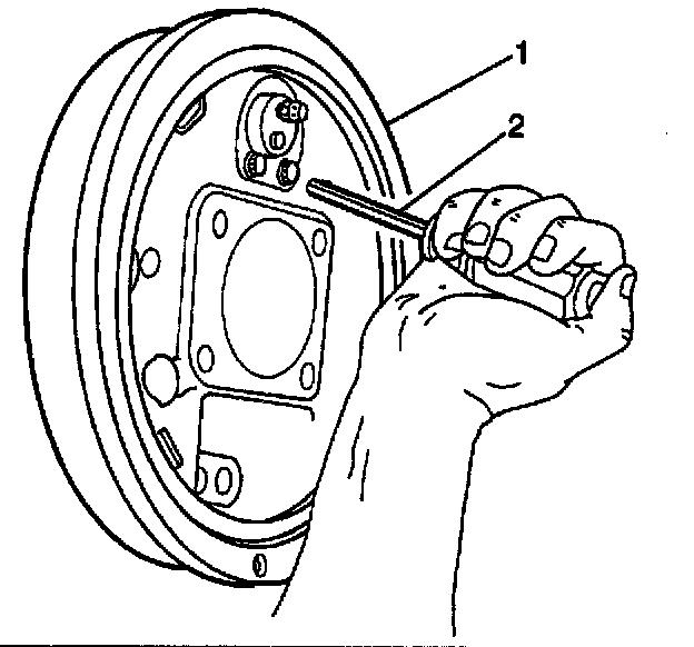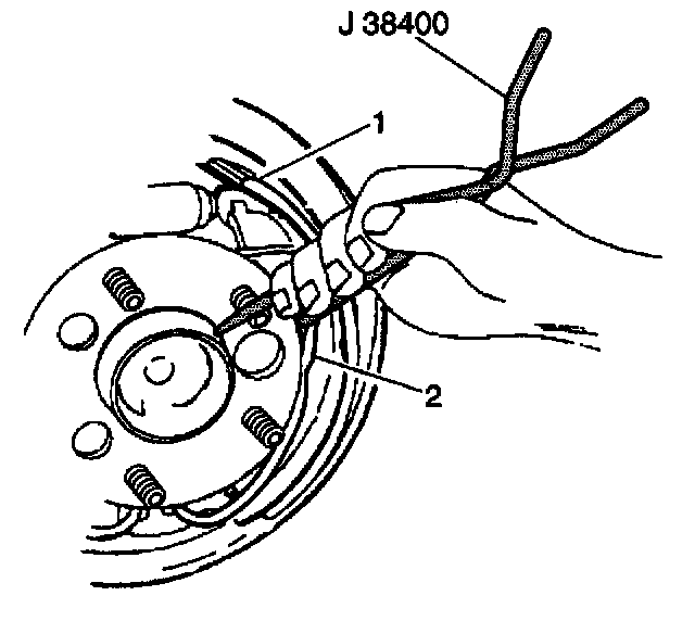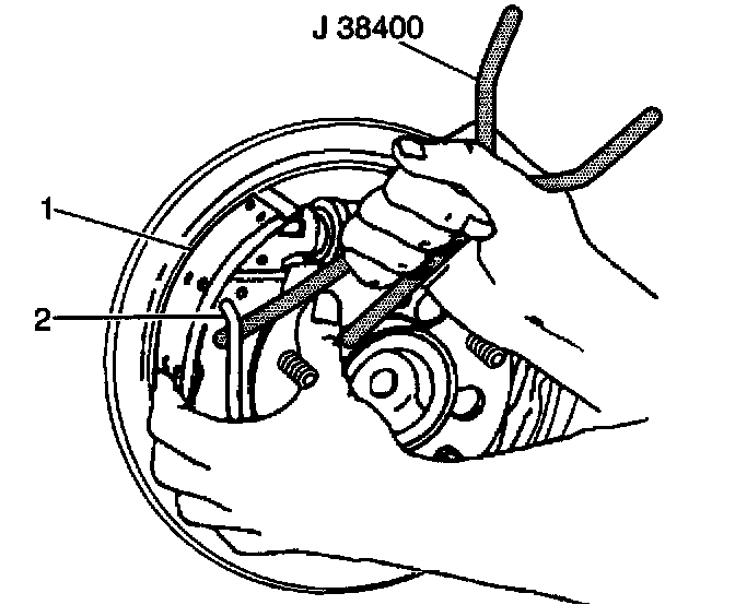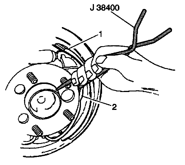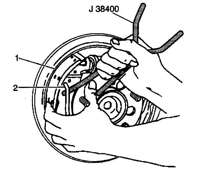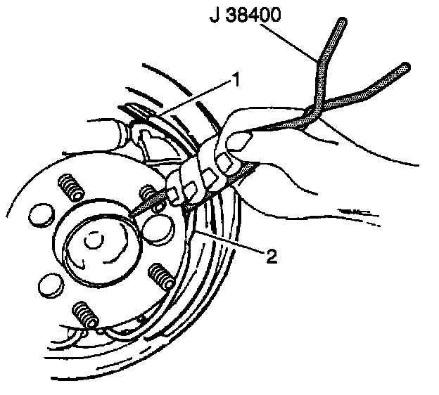 13. Lift the end of the return spring (2) from the brake shoe (1). Insert the hook end of the J 38400 between the return spring and the brake shoe web. Pry or twist the J 38400 in order to lift the end of the spring out of the shoe web hole.
