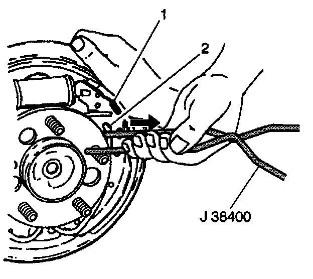 3. Use the J 38400 in order to pull up the end of the return spring (2), resting the return spring on the web of the brake shoe (1).
