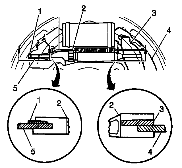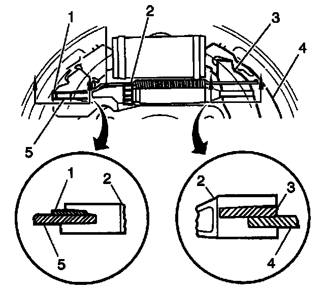7. Remove the lift end of the return spring (2) from the adjuster shoe and the lining (1).