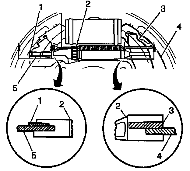^ Engage the adjuster nut end of the adjusting screw (2) with the web of the brake shoe and lining and the parking brake lever (3)