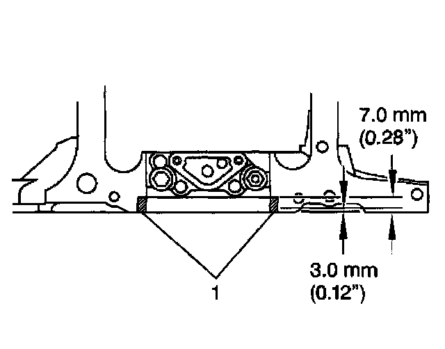 1. Apply a small amount of sealer GM P/N 1234579 or equivalent on either side of the rear main bearing cap, where the seal surface on the cap meets the cylinder block (1). Press sealant into the gap with putty knife.