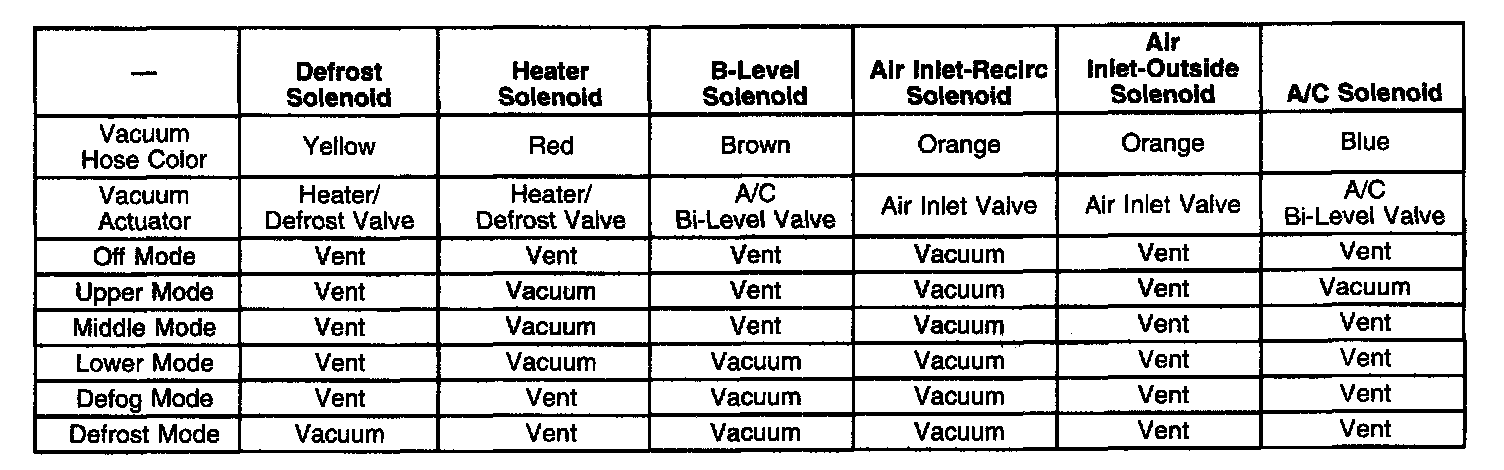 ^ Check for vacuum to the mode valve actuators by noting mode valve actuator position. When vacuum is applied, the actuator will retract, refer to the Air Delivery Vacuum Distribution table.