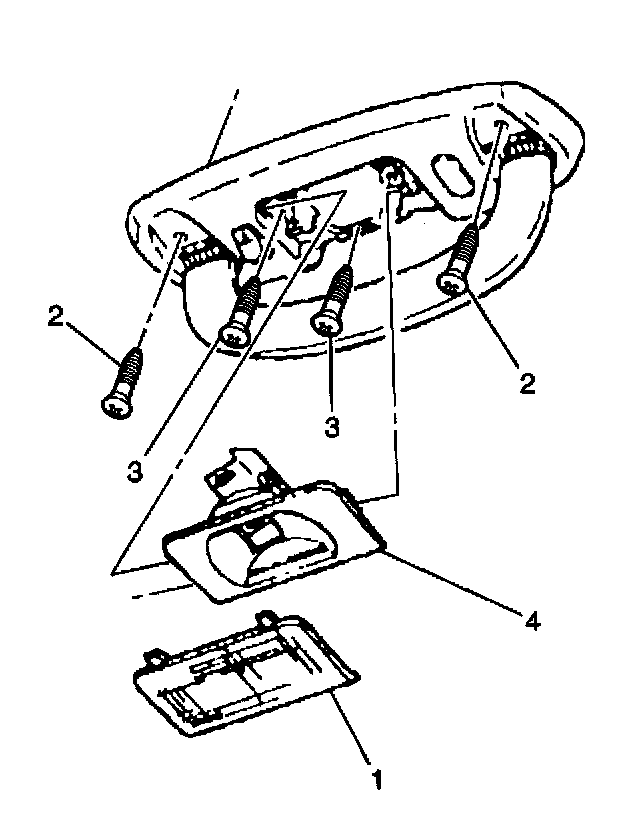 3. Using a small flat-bladed tool, carefully pry at an edge of the side rail lamp lens (1) to release the retaining tabs, then remove the lens from the assist handle.