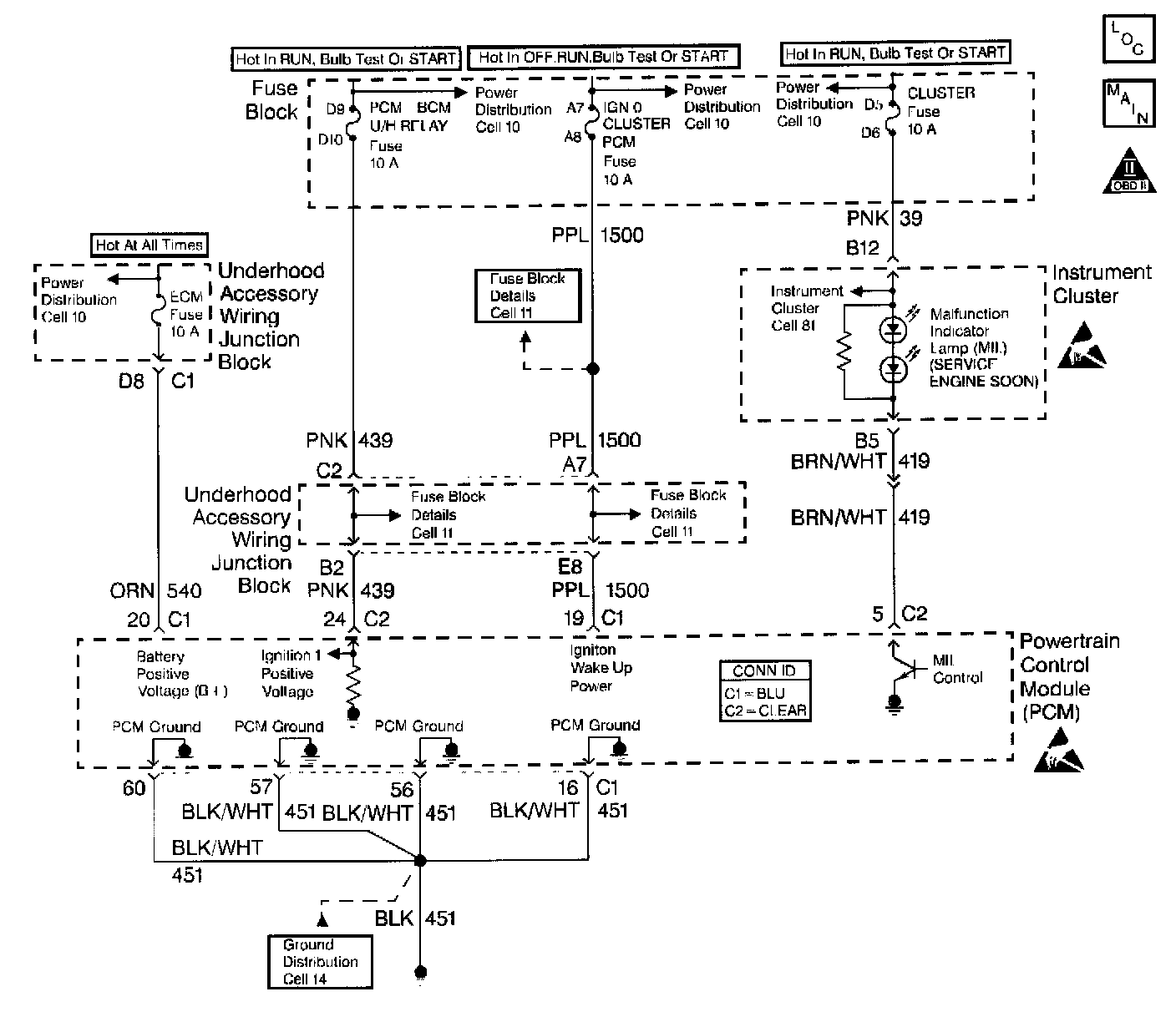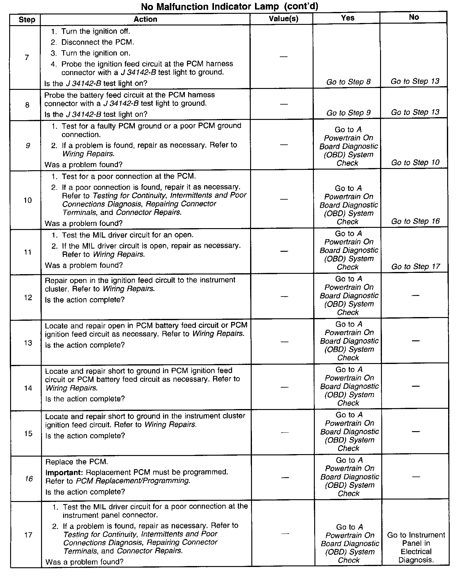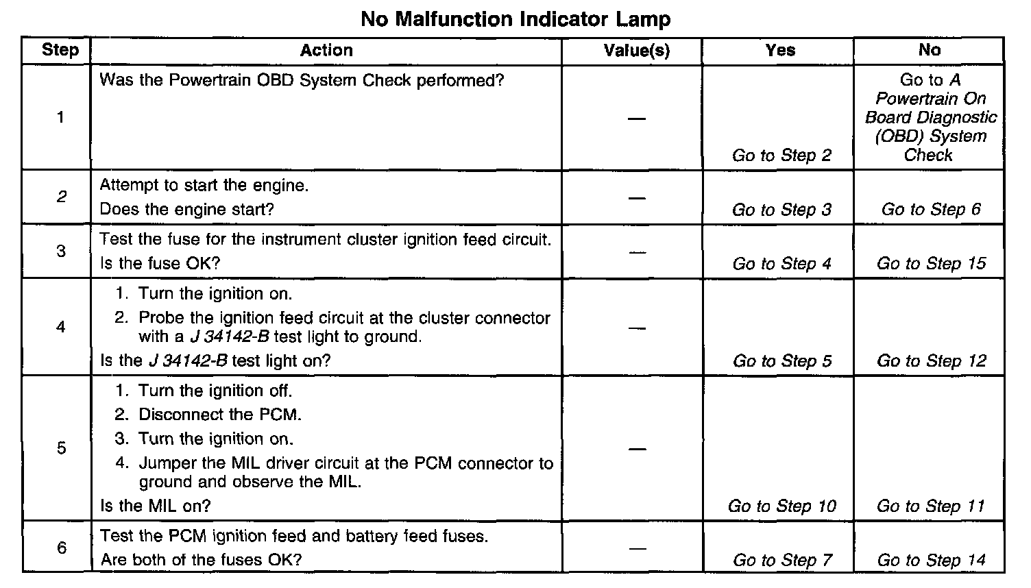 A Diagnostic System Check must be the starting point for any driveability complaint diagnosis. Before using this procedure, you should perform a careful visual/physical check of the PCM and engine grounds for being clean and tight. Refer to Visual/Physical Check in Symptoms. A Diagnostic System Check is an organized approach to identifying a problem created by an electronic engine control system malfunction. No MIL with the key ON, engine not running and DTC P0650 Malfunction Indicator Lamp (MIL) Control Circuit set suggests an open in the MIL driver circuit. Initial Inspection and Diagnostic Overview